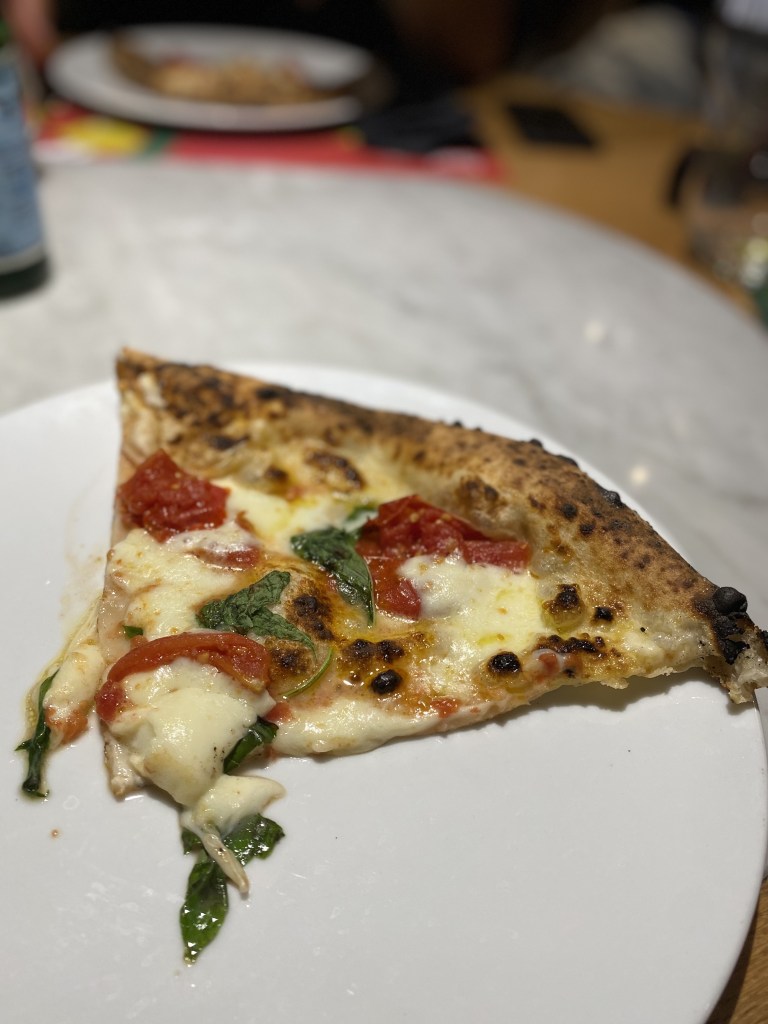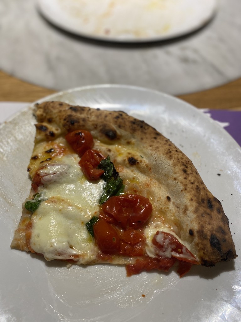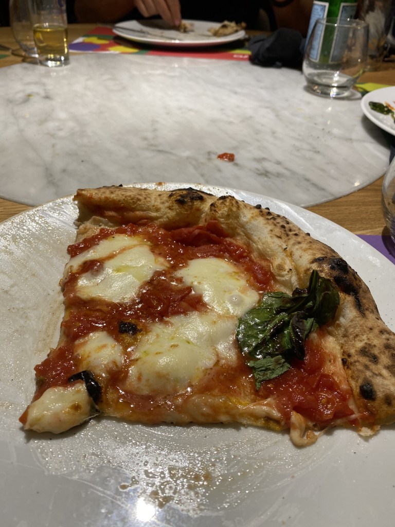 Ancora spazio per lo stupore. Sorprendere alla quinta si può! Arriva il Cannellino Flegreo con la sua buccia sottile, la polpa soda, il colore di un rosso fiammeggiante e un gusto tra dolcezza, acidità e sapidità. La Margherita Flegrea ha un ordine inflessibile: in cottura passata di pomodoro, Parmigiano Reggiano DOP 24 mesi di stagionatura, fiordilatte, olio extravergine d’oliva Carpellese di Madonna dell’olivo. Armoniosa, precisa, dai toni netti. Il parmigiano fonde, l’evo ammalia. Una margherita senza scrupoli che sfoggia l’eleganza di un equilibrio sopra la follia. Peccato per la cottura bruna. Metafisica.
