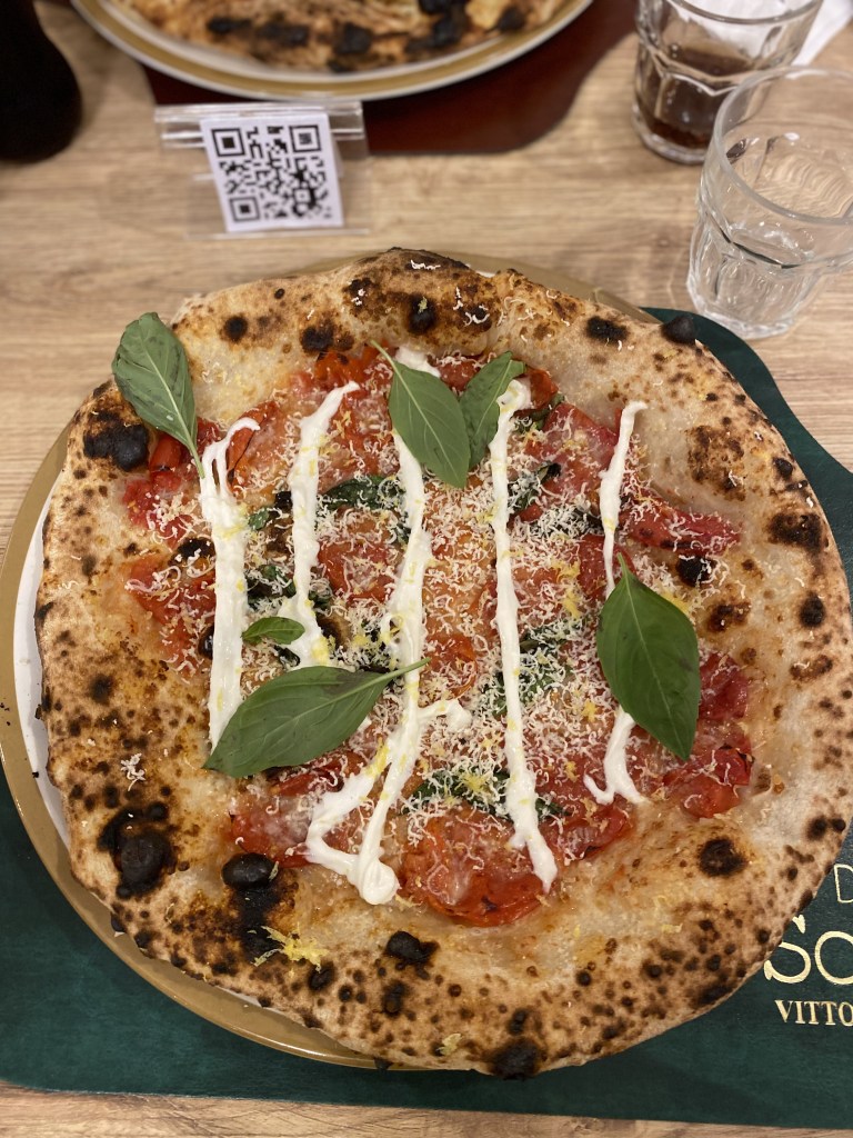 L’impasto è diventato un soffio. Personalizzatissimo. Un po’ di filler nel cornicione. Farine 0 e una percentuale di farina integrale, lunga lievitazione e maturazione per un morso soave, quasi impalpabile. Strutture rigorose, cotture da lode, topping dall’aria sempre vivace, giocosa, mai piatta che intreccia presidi e chicche di nicchia.