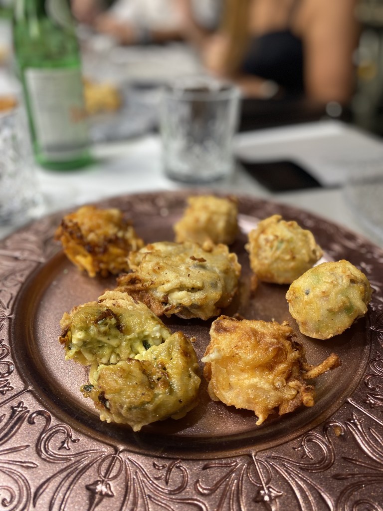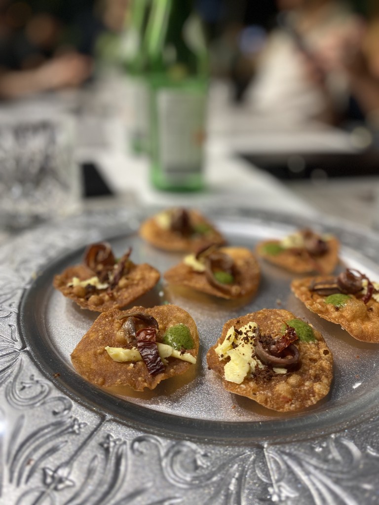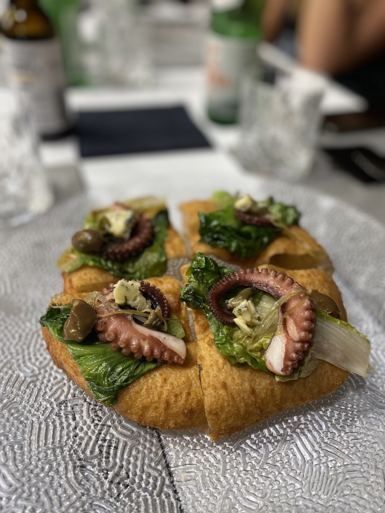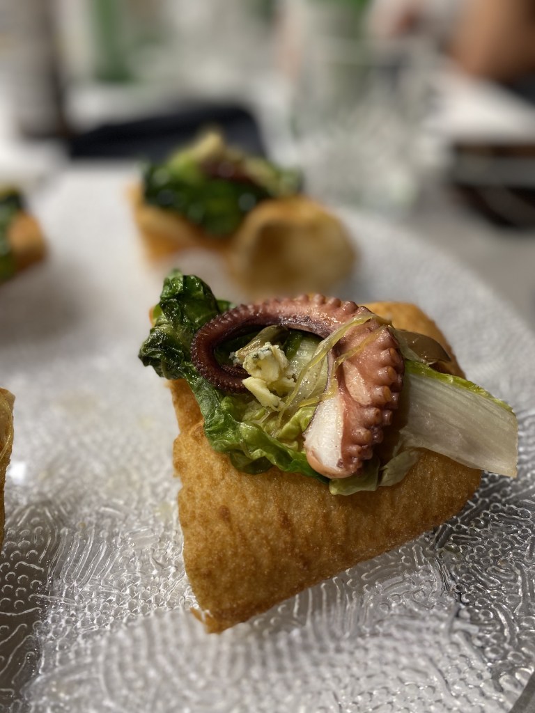 Come una matrioska le sette sorelline. Degustazione nella degustazione. Collezione di frittatine: classica, Nerano, paglia e fieno, peperoni, quattro formaggi, olive e capperi, parmigiana. Luci stroboscopiche non adatte a spettatori fotosensibili. Una più indovinata dell’altra. Saporite e croccantine, cremosità inside crunch outside. Non ricordo l’inizio del discorso, ma la confusione è sinonimo di buono. Fearless.