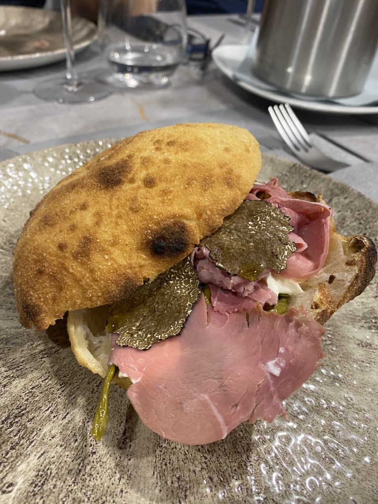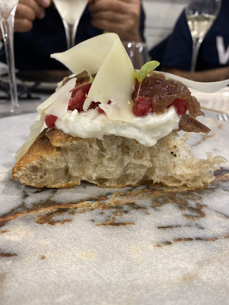 Crea con libertà Giuseppe e accoglie con una montanarina fritta (e asciugata al forno) ripiena a valle di latticello di Pezzata Rossa, tartufo nero estivo, prosciutto cotto artigianale di Bufalo e asparagi. Una carezza in un pugno. La persistenza del simil-bun saporito, iperdry, con la giusta dose di crunch, incontra la leggiadria di un ripieno dai toni caldi che abbraccia monocromaticamente. Ullallà!