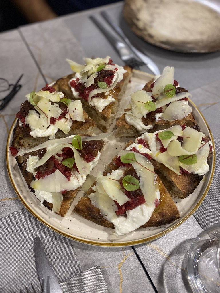 Arrivano, infine, veri e propri piatti di impasto, dove quest’ultimo sposa sempre la causa. Nella Oca Caprina lo speck d’oca gioca tra pascoli e boschi, incontrando e mo il caprino di Capra mantecato e la polvere di erbe selvatiche e mo i cremini arrostiti e il tartufo. Conoscenza e consapevolezza. L’Essenza di Gambero è una profumeria. Il Rosso in purezza e in nettare, bisque, concassé di pomodori, poi l’amaro della crema di melanzane, la cremosità della stracciata, i capperi, le olive nere, l’origano. Temperature, consistenze, accostamenti. Maestria e cura. Vroom!