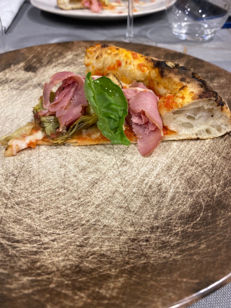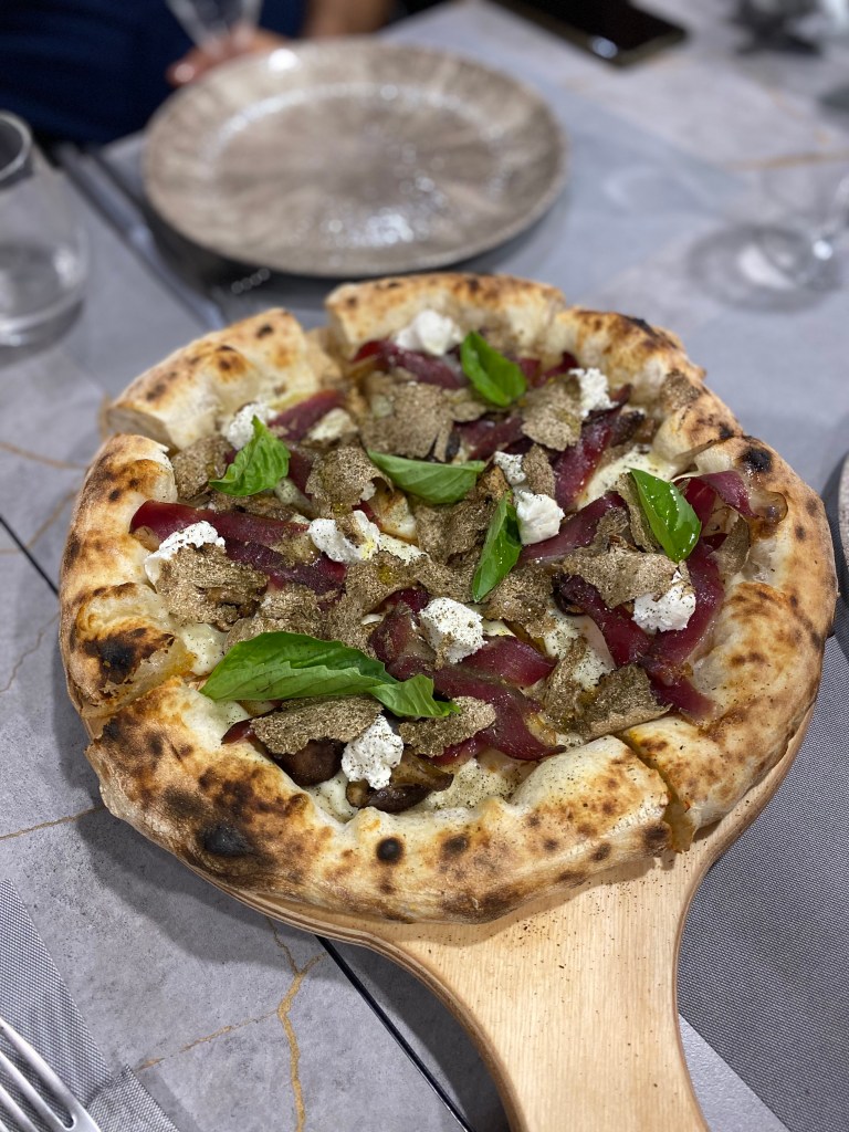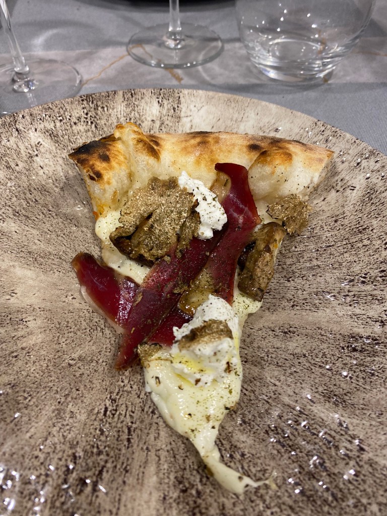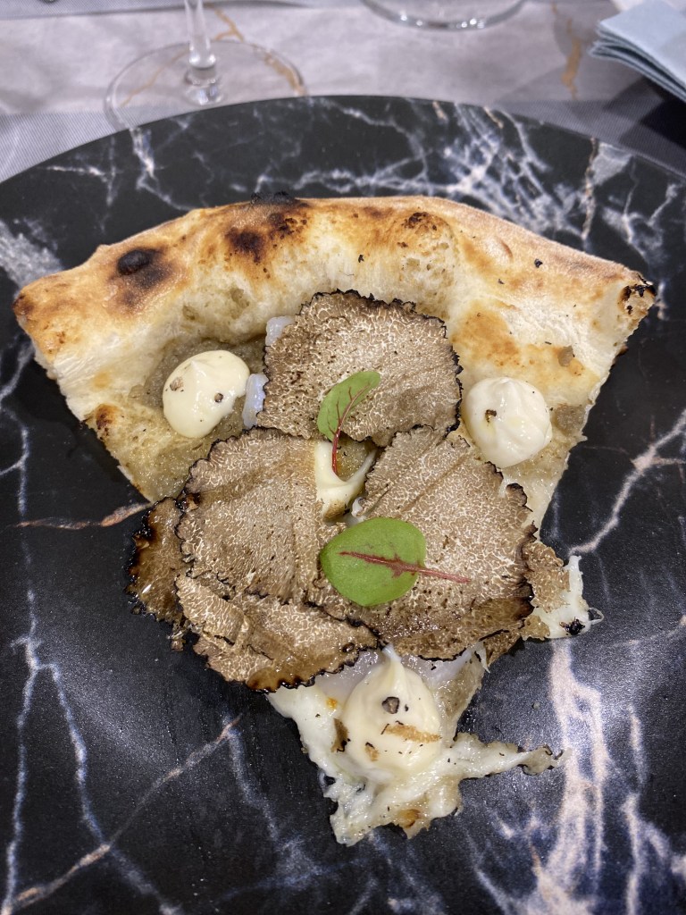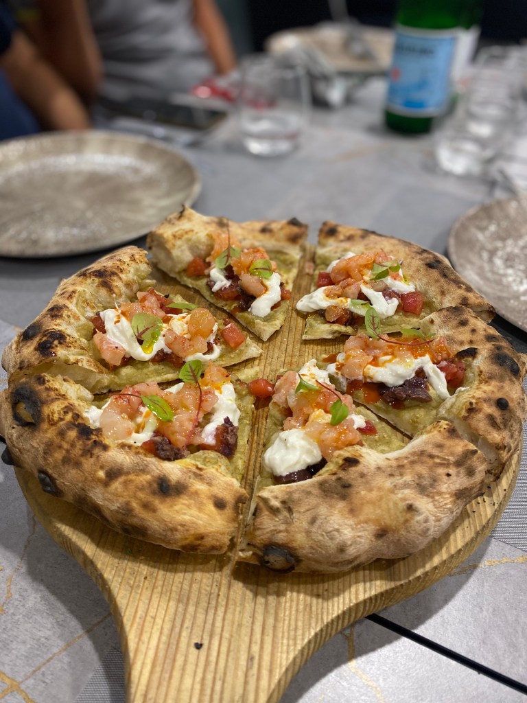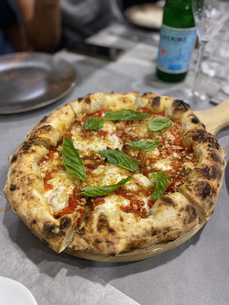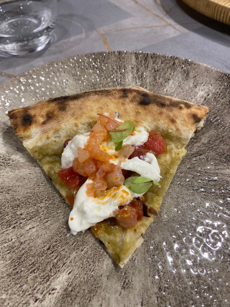 La pizza è l’onnipresenza della sua stessa ispirazione. Sua, identitaria, fatta di mente e cuore. “Un po’ di acqua e farina” – per citarlo – ma sempre precisa, elegante, armoniosa. Moderna con cornicione, evviva!, più timido, fondente al morso, cotta da mani maestose (che bravo il fratello Antonio), che accoglie la mirabilità degli ingredienti, dal mare alla terra, dagli oli ai formaggi, eccellenze su eccellenze del territorio, che danno unicità al suo prodotto.