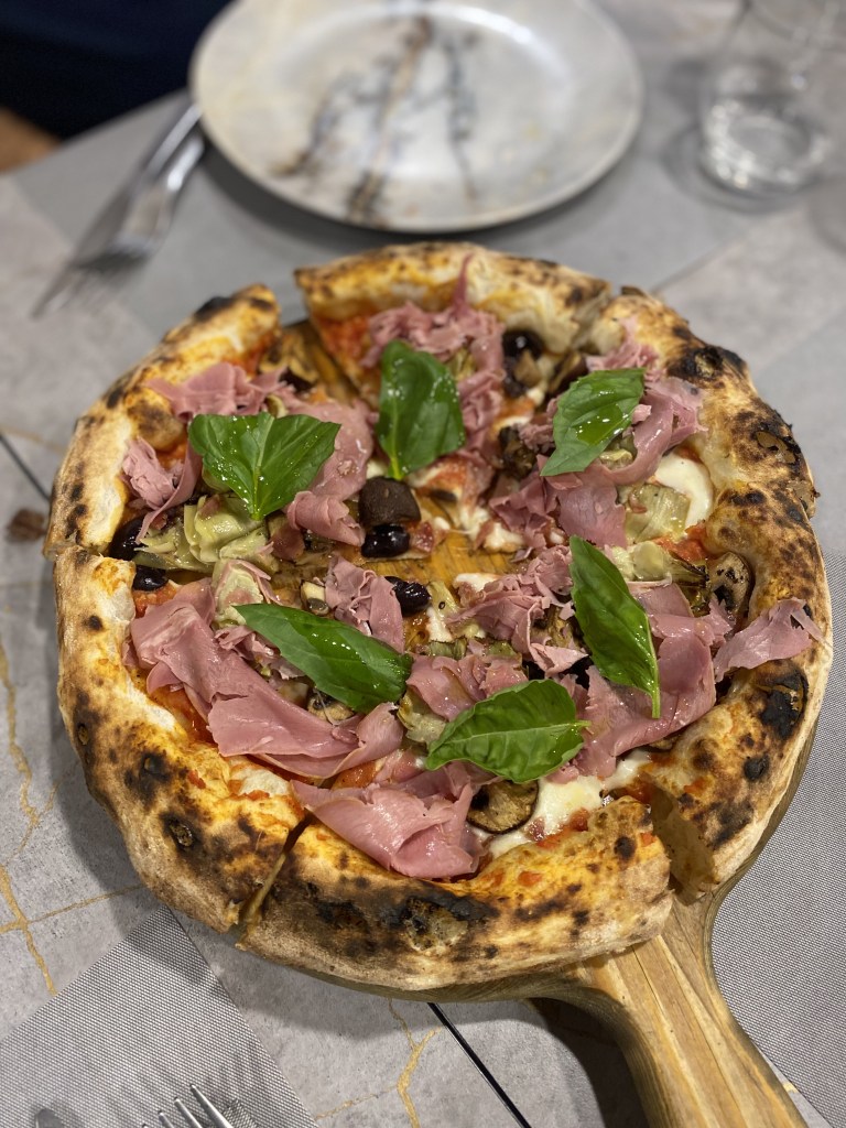 Che poi Giuseppe non profana la tradizione, la Capricciosa Bove mi è testimone. Affrescata alla maniera del Pinturicchio con colori mirabilis: passata di pomodoro ramato arrostito, fiordilatte già citato, funghi cremini arrosto, carciofi bianchi di Progetto Spesa, prosciutto cotto di cui sopra, salame del Sannio, olive nere di Leccino. Tutti presenti, tutti coerenti, tutti coesistenti. Arrivano insieme, da soli, prima e poi dopo. Pizza allo stato puro che scuote ed eleva la bellezza dell’impasto e, laddove si chiudono gli occhi, si odono fate capricciose. Boom!