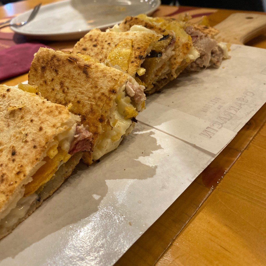 Il crunch O’ Sarracin lo mette tutto nella Mattonella. Un po’ panuozzo, un po’ ripieno, un po’ saltimbocca. La Riggiola, con mozzarella, porchetta d’Ariccia, provola, melanzane arrostite e chips di patate, scrocchia per involucro e companatico. Vibrante, caciarona e goduriosa. Vanitosa.