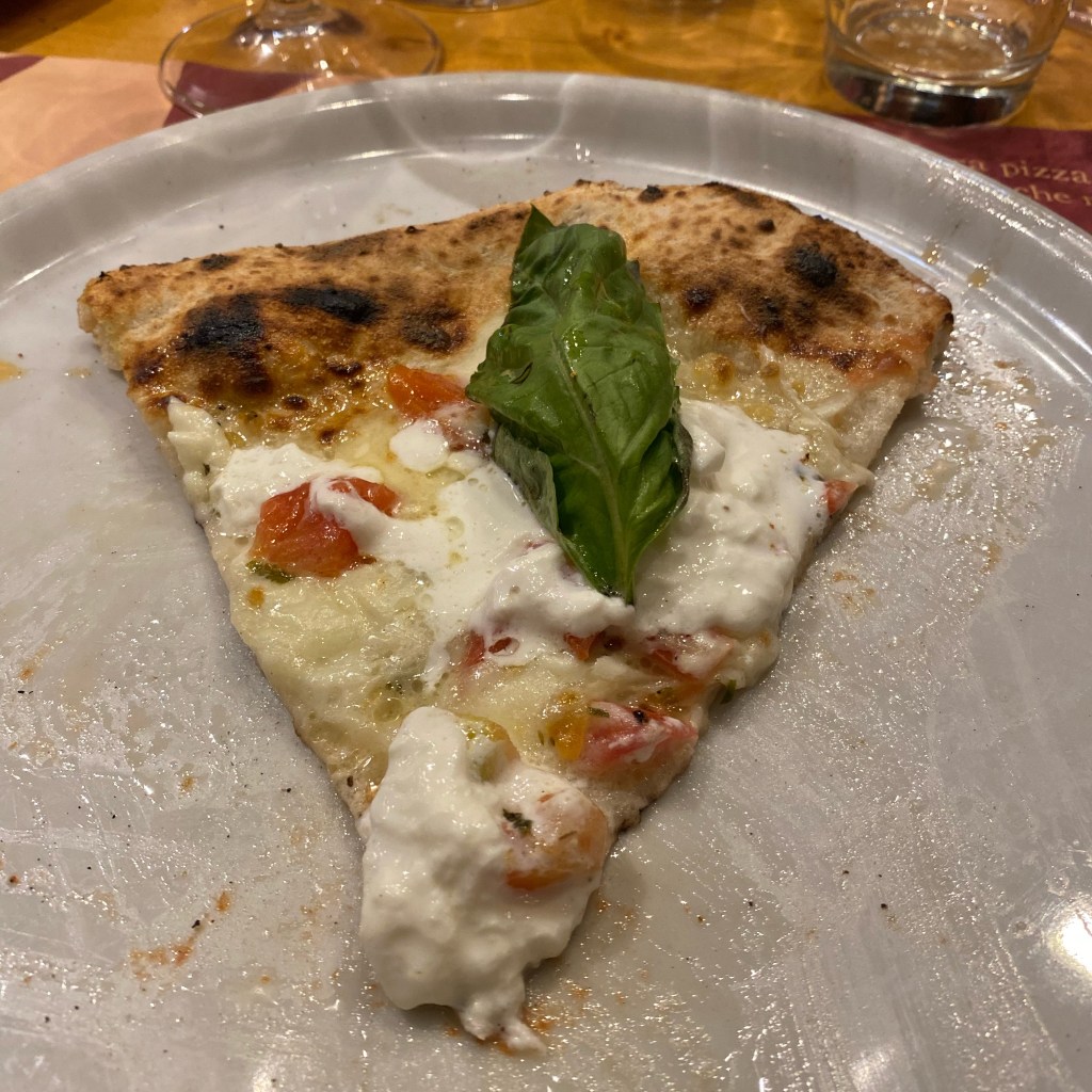 La Amalfi viene conciata a fine cottura: stracciata, pomodori a crudo marinati e zeste di limone. Fresca, cremosa, lineare con la cottura sempre vincente. Semplicità concisa.