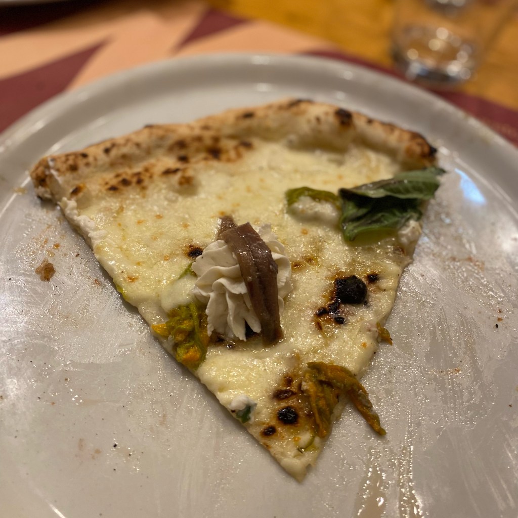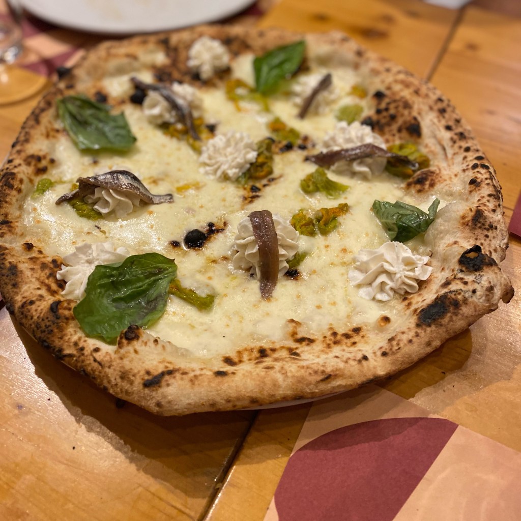 La Fior di Alici, con fiordilatte, ciuffi di ricotta, fiori di zucca e alici, vive della scomposizione di una grande classico. Saporita.