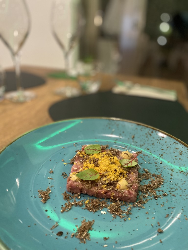 Un quadro di manzo la tartare con tartufo, gel di senape, bottarga d’uovo e polvere di scalogno. Piatto libero da riferimenti, audace e attraente e sincero.