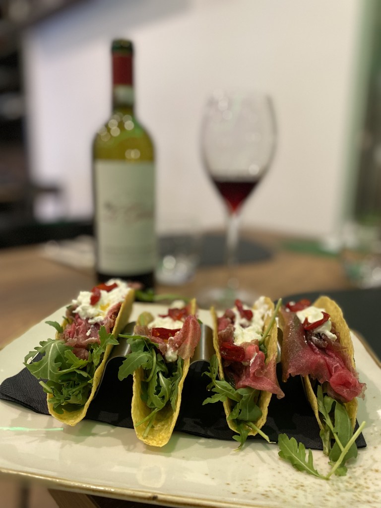 Abbondante, giocoso e florido il Tacos tricolore, con rucola, carpaccio di manzo, stracciata di bufala e pomodorino confit.