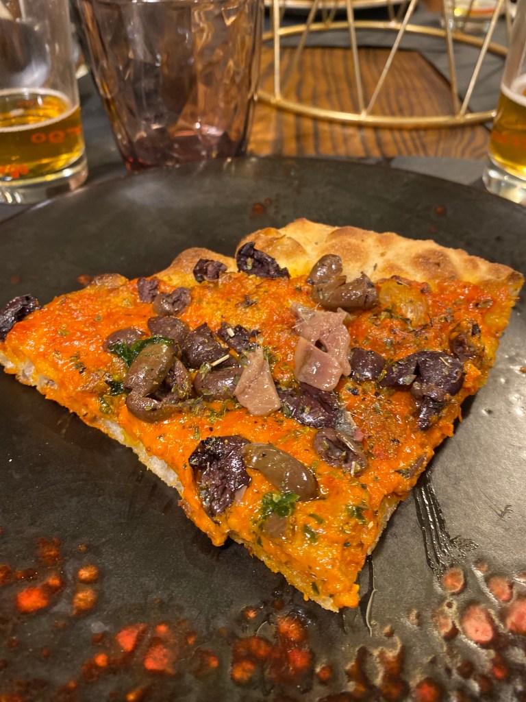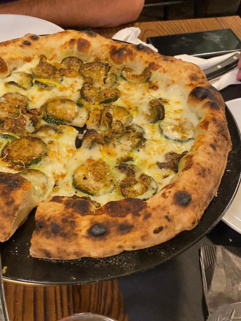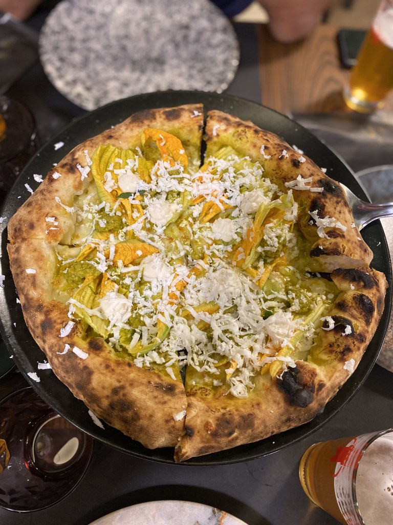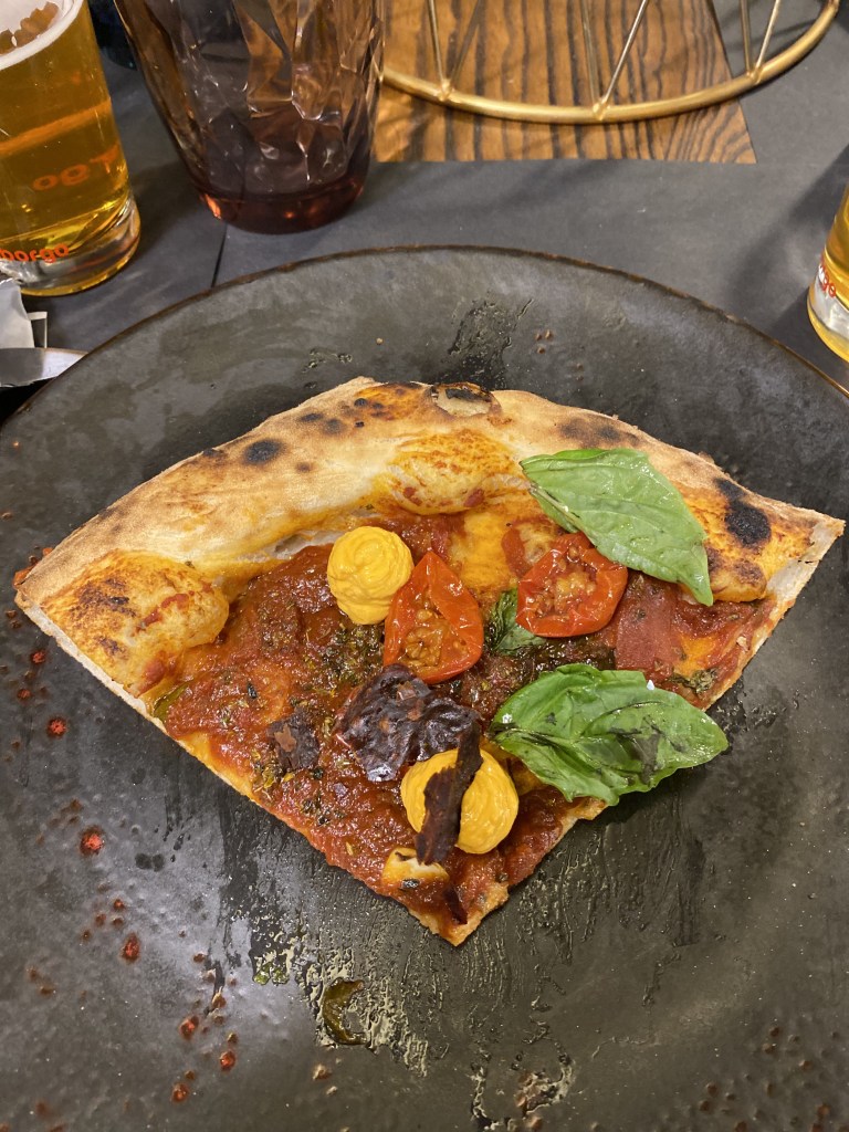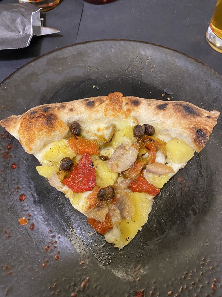 Nomen omen. Cicciosposito. Romanzo stellato su pizza. Come un dipinto di un preraffaellita. Alici marinate in sale e zucchero e affumicate, che meraviglia! La base di pesto di prezzemolo con latte di bufala, tono su tono di delicatezze diverse. Per capirne l’Idilio non basta la penna. Ma il serafico morso, ricco della cucina povera mediterranea, negli ultimi attimi suona guascone col gel di limone e il crunch dei pinoli tostati e selvatici. Lost my heart…