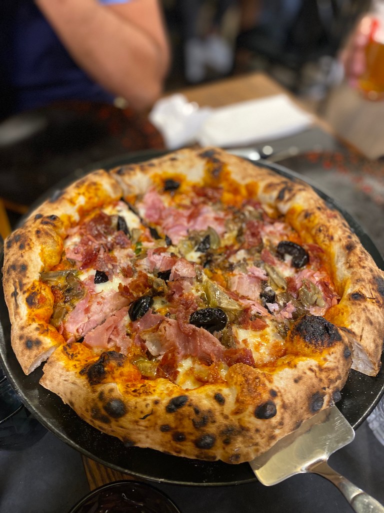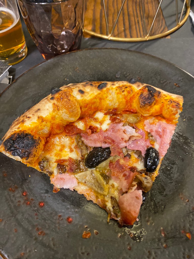 Ma la confusione è precisa in amore. Quello per questa Capricciosa confonde, stordisce. Buona da schiantarsi, la Stratocaster di Martucci spaccata a mo di Jimi e, come in un cartone animato, girano le stelline. La tradi-perfezione. Conservative-innovation: crema di pomodoro arrosto, fiordilatte, carciofo bianco di Pertosa, olive caiazzane al forno, funghi pleurotus saltati, prosciutto cotto di suino grigio pelatello teanese, salame di suino croccante. Sincronico equilibrio, disarmante piacere e sfrenata allegria. E il salame che scoppietta è una figata pazzesca! Senza termini di paragone.