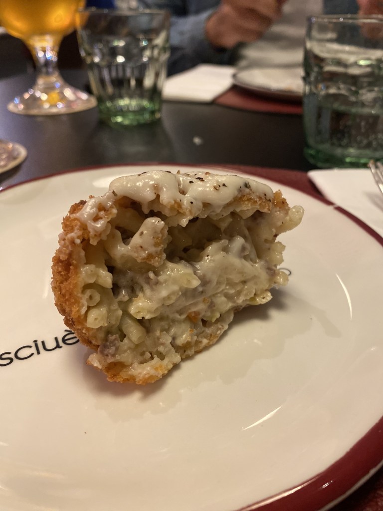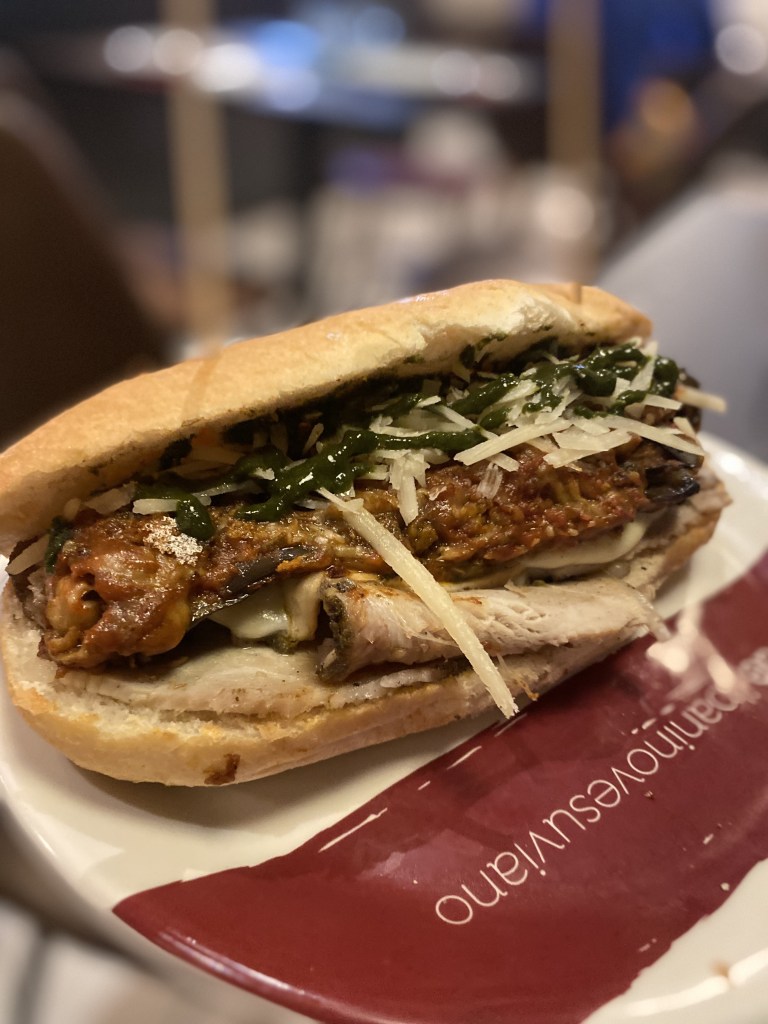 La ciabatta scrocchia, la porchetta è succosa, aromatica, abbondante, la provola affumicata fa da ponte con la parmigiana di melanzane rossa, buona più di quella della nonna. L’emulsione di basilico aggiusta in freschezza e le scaglie di Parmigiano Reggiano in sapidità.