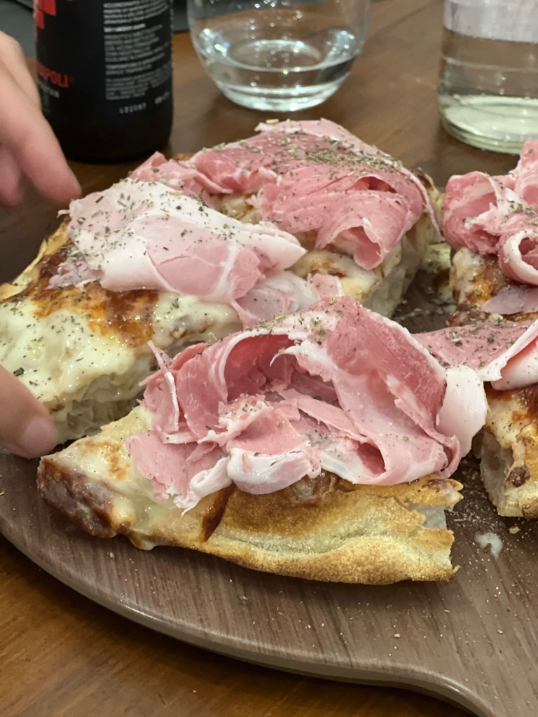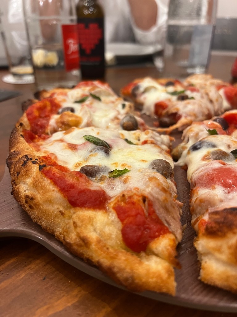 Si parte sottilissimi, croccantissimi e mascherati… La Margherita Mascherata, ombra di pomodoro San Marzano, fiordilatte di Agerola, scaglie di Grana, filetti di pomodori pelati al forno, basilico riccio napoletano, si veste di crunch, su impasto con idratazione 110% e cotta nel forno elettrico. La Rustichella è l’appetizer perfetto, simpatico, dal morso giocoso, intriso di sapore, idea assolutamente hygge. Crunchita.
