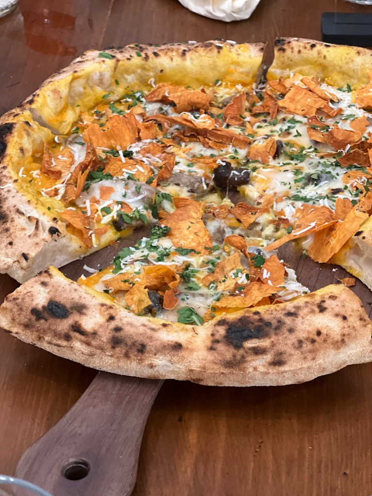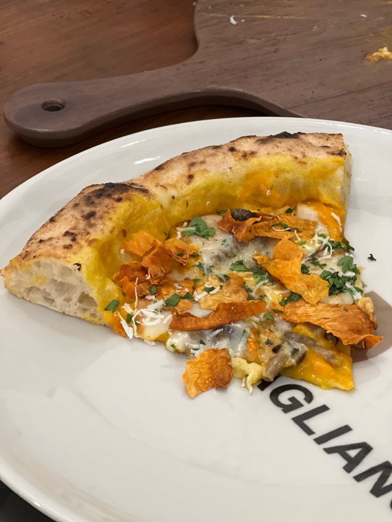 Fantasia d’autunno su impasto classico è una combinazione di sapori, colori, essenze, profumi, aromi con l’orange power. Zucca double face, dolcezza cremosa e briosità croccante, i chiodini accendono l’umami, il cacioricotta cilentano aggiunge sapidità, il peperoncino spinge e il prezzemolo tritato rinfresca. L’Autunno in versi.