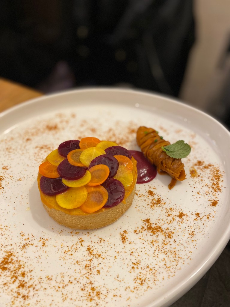 Due inizi croccanti. Il bocconcino di french toast con sedano rapa al tartufo rinfresca e diverte. Equilibrio. Un quadro di Kandinsky la tartelletta al parmigiano con finocchi, rapa rossa, zucca e