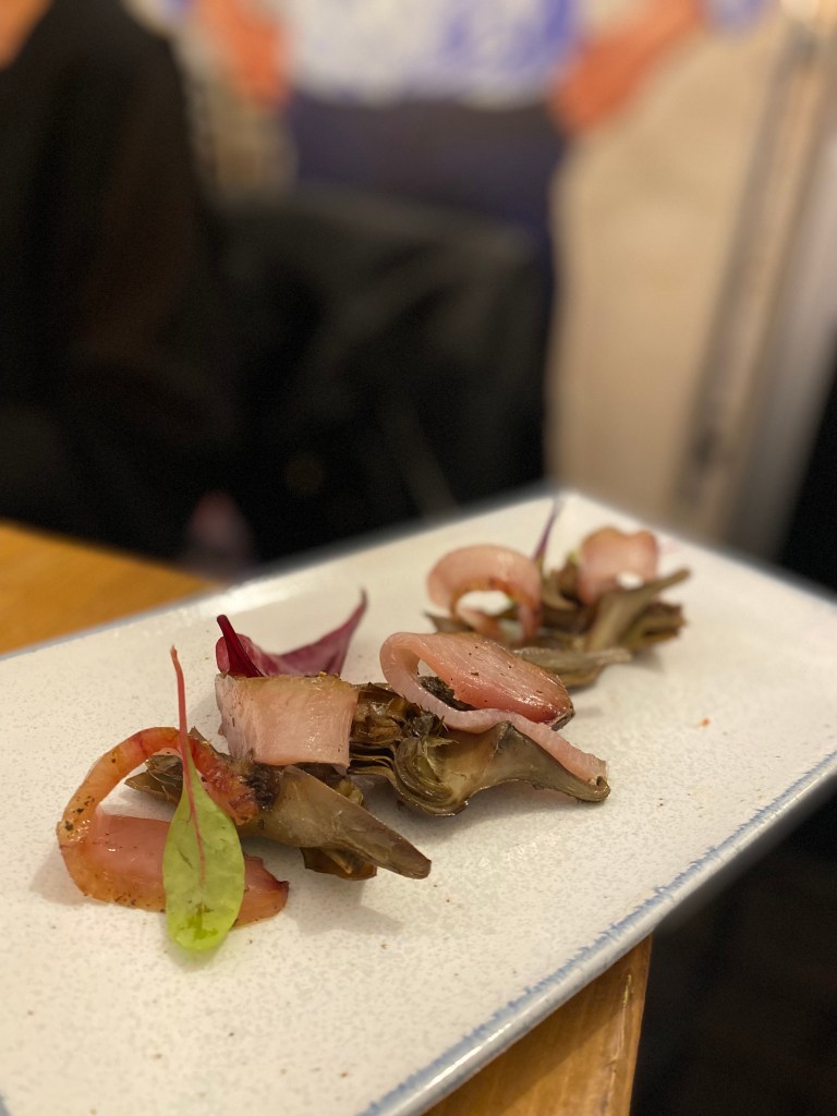 La ricciola urla di gusto col carciofo in oliocottura. Frascionismo.