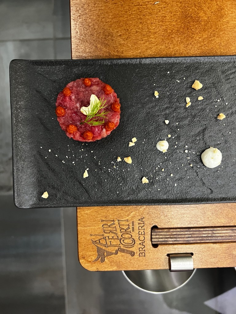 Con la ciccia cruda sono andato subito in estasi. Bella la tartare di scamone di scottona bavarese con spuma di parmigiano, crema di pomodorini semi dry e granella di anacardi. Morbida, succosa, piena di personalità ed eleganza. Immersiva.