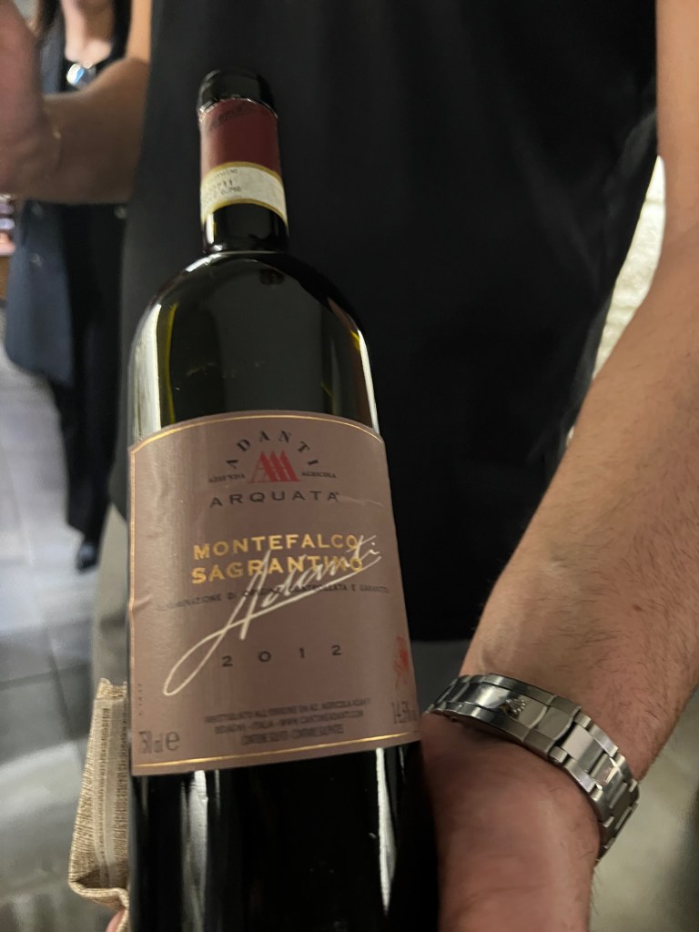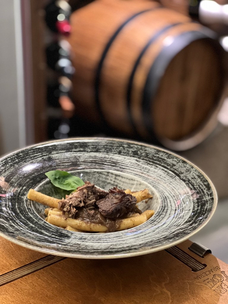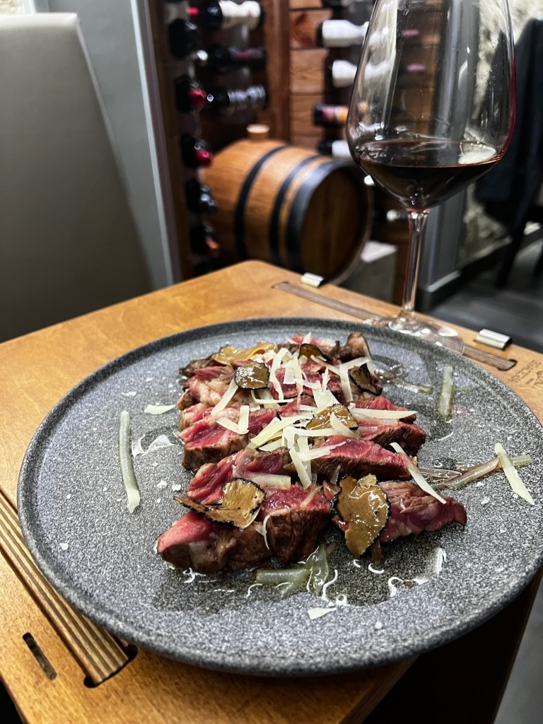Poi la sincerità della brace, la gioia in carta: tagliata di Black Angus al tartufo con provolone del Monaco e costata di scottona bavarese. La prima succosa e tenera con la spinta umami vero fil rouge; la seconda strepitosamente morbida e intensa. Entrambe eccezionali in termini di sapore e consistenza. E nel calice? Sagrantino di Montefalco DOCG 2012 – Adanti.