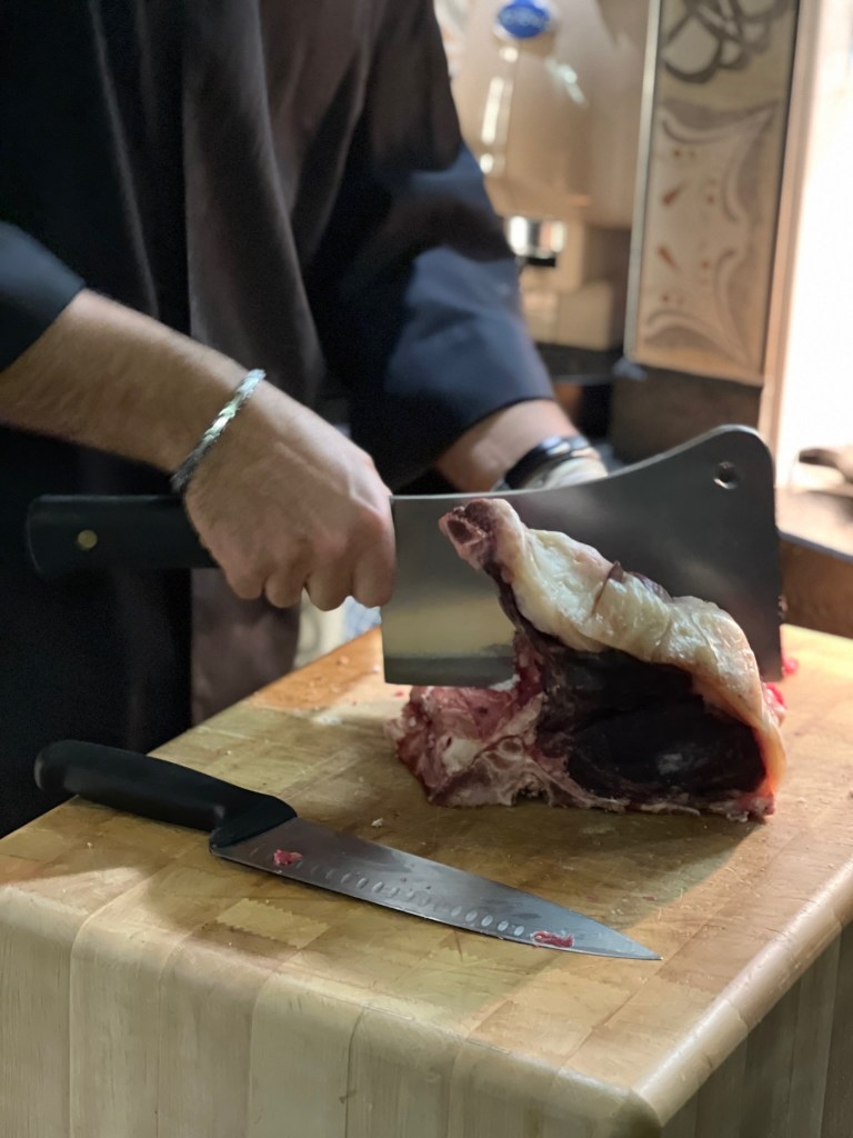 Uno da sempre nel mondo del vino e in quello della ciccia, l’altro a incidere, disegnare e comporre con perizia al ceppo e in cucina.