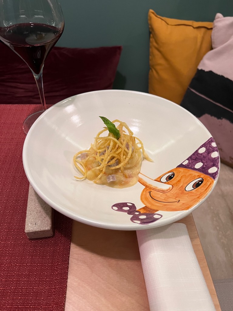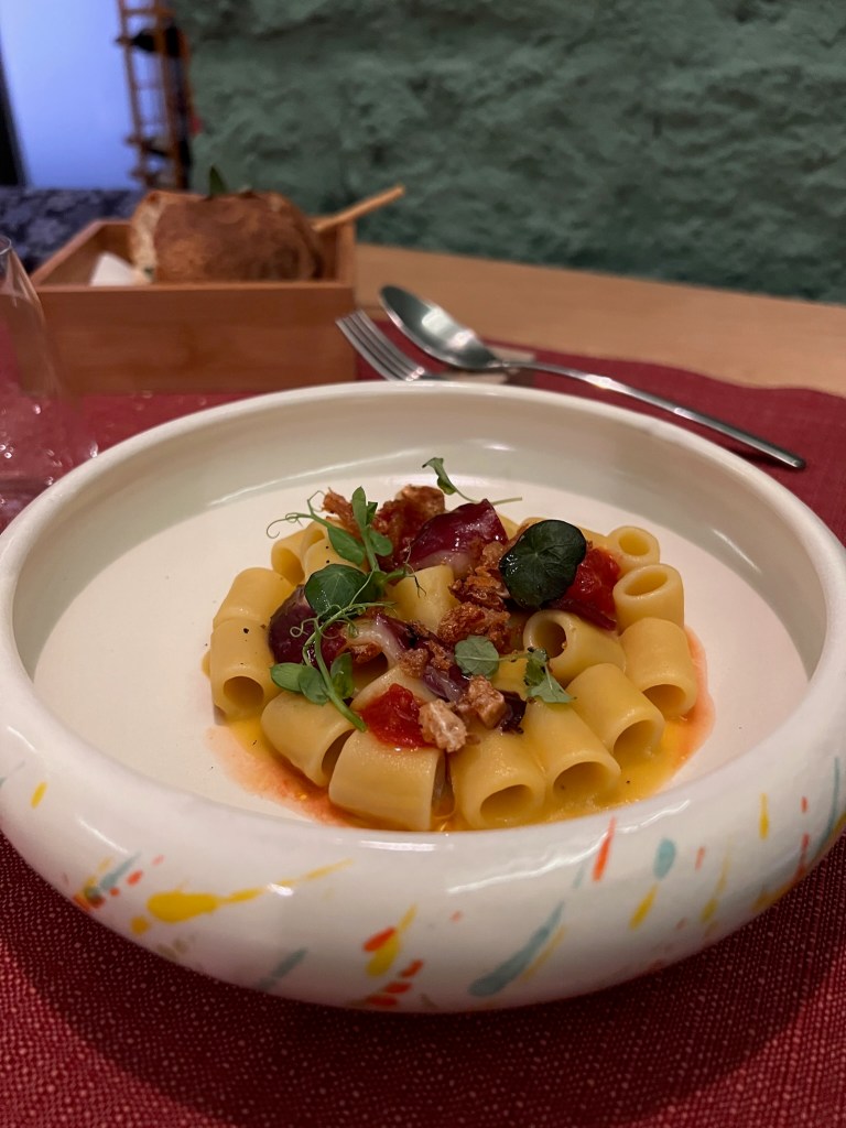 Il Tubettone cannellino e cannellini mio prefe tutta la vita. La cremosità delicata della vellutata di fagioli, il trittico preciso tra dolcezza, acidità e sapidità del battuto di pomodoro cannellino flegreo pelato, l’eleganza vanitosa del petto d’anatra che dona zing e l’aromaticità dell’olio al rosmarino. Tutte le note per un tubetto perfetto. Reazione post-assaggio: commozione.