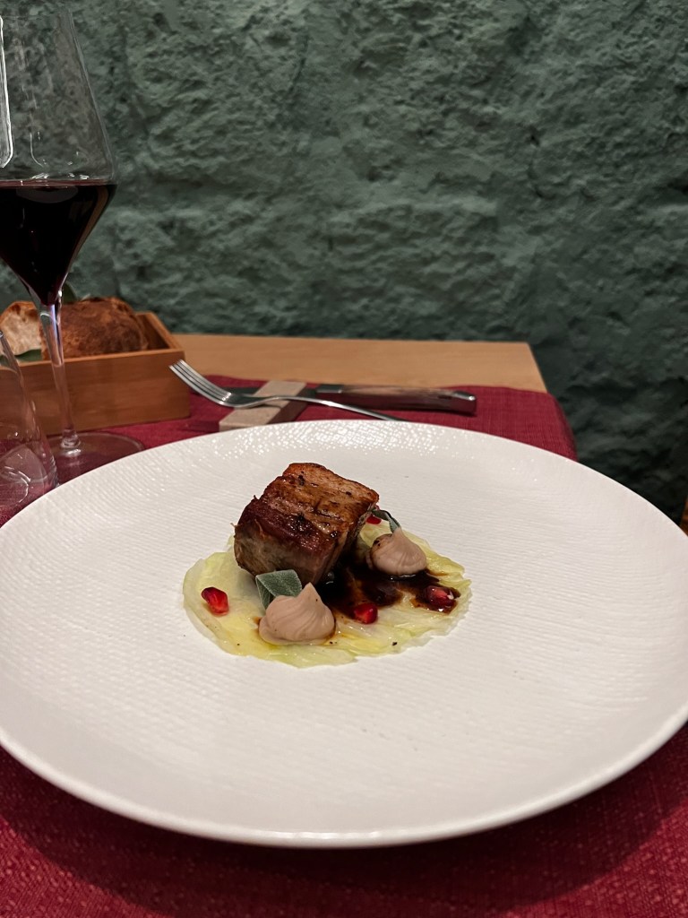La pancia di maiale cbt con purea di castagne, tartufo e verza è il manifesto gastronomico della maturità dell’autore.