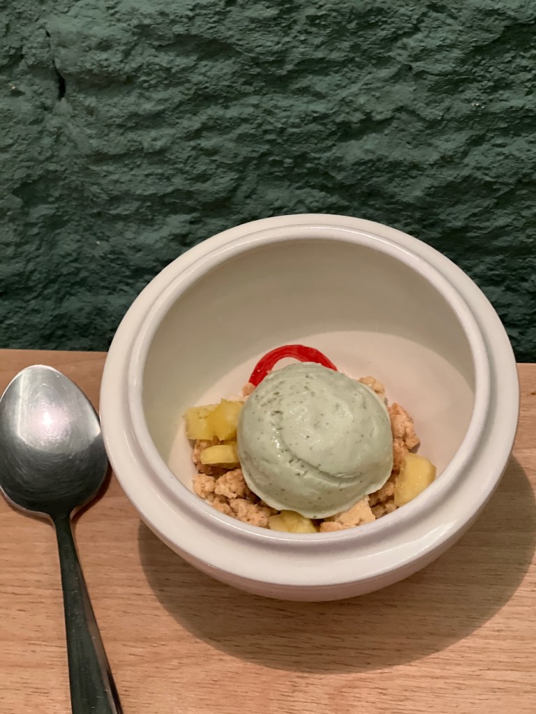Il gelato al rosmarino con ananas arrostito e crumble agli agrumi è un rinfrescante pre-dessert su note acidule e aromatiche che predispone i sensi alla dolcezza. Poi loro ci aggiungono anche grazia e bellezza con complesso coloratissimo di giochi agrodolci col semifreddo alle mandorle con spirale di lampone e velo di loti.