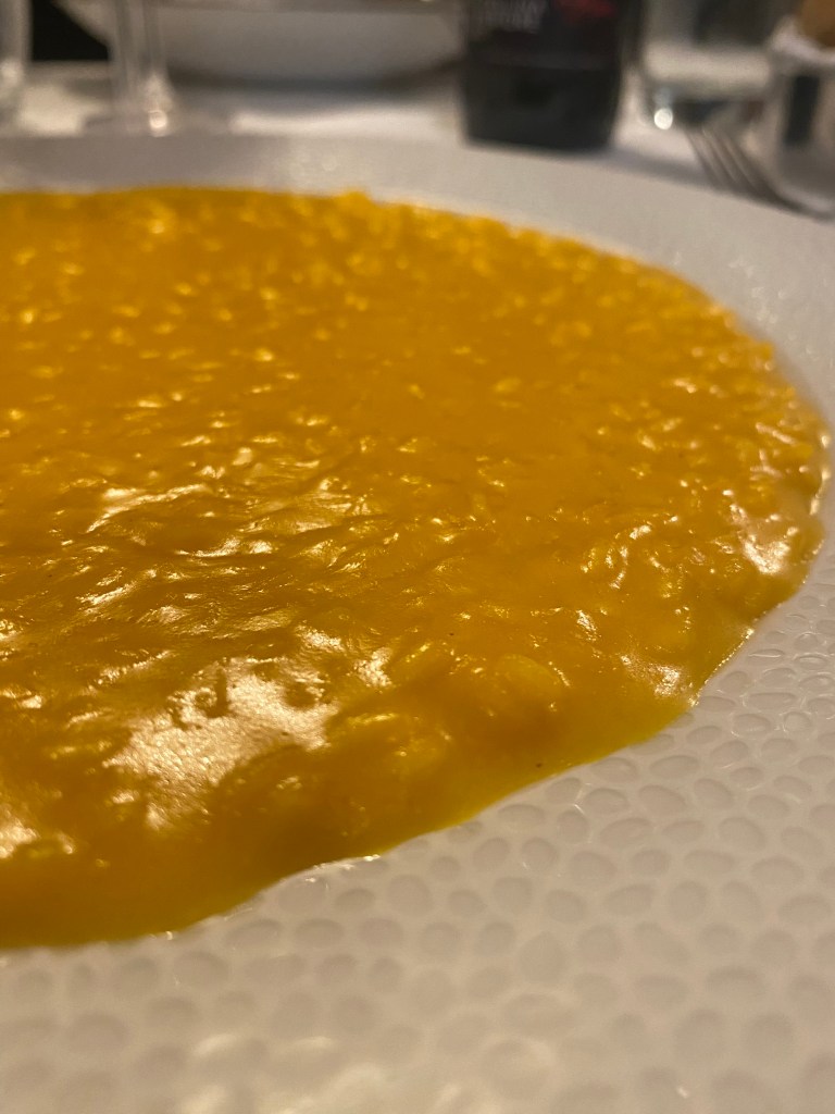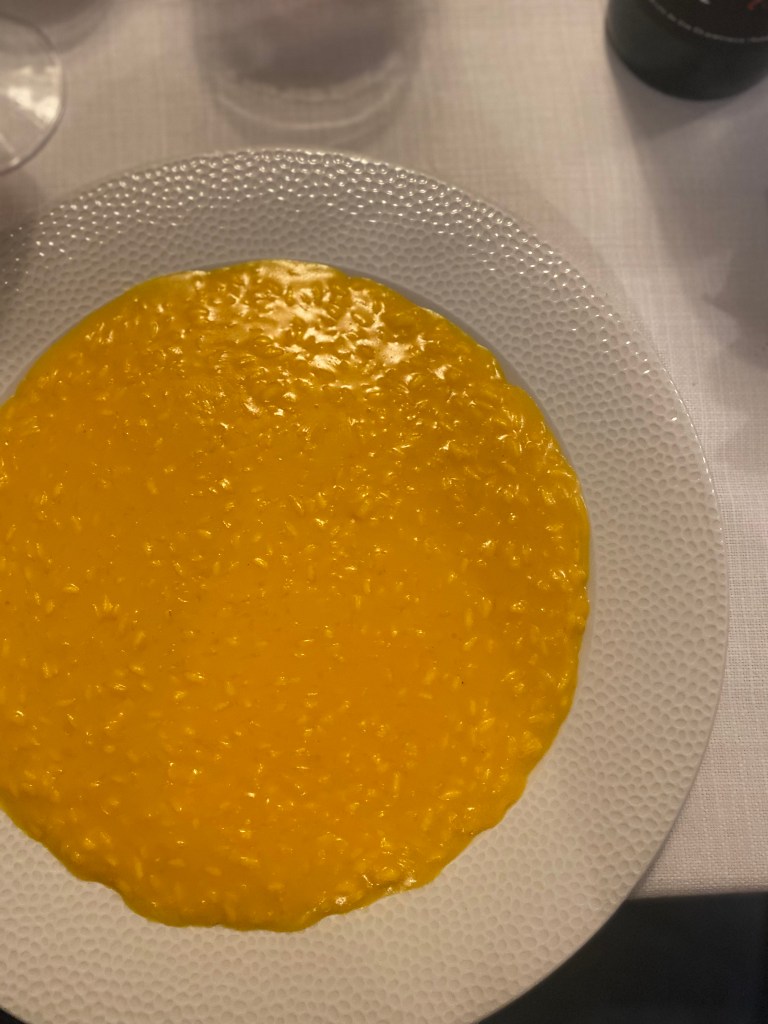 O risott giald, carnaroli molto al dente allo zafferano e il Grana Padano riserva usato in abbondanza.