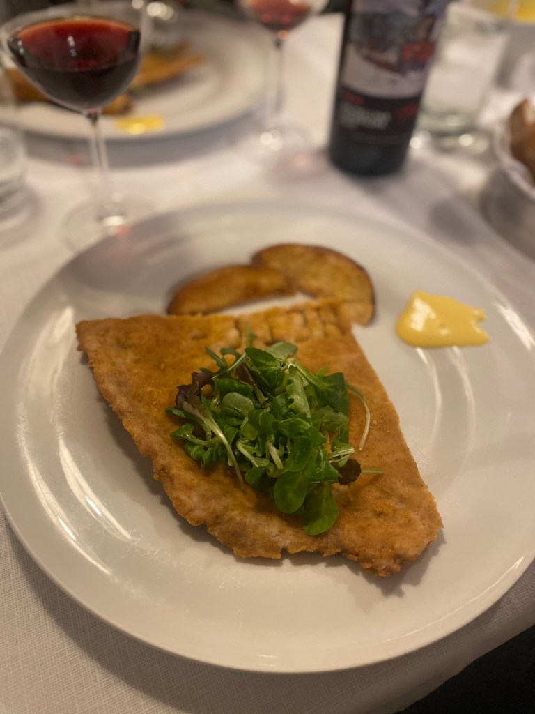 L’Orecchia d’elefante con osso, battuta, impanata e cotta in padella con olio.