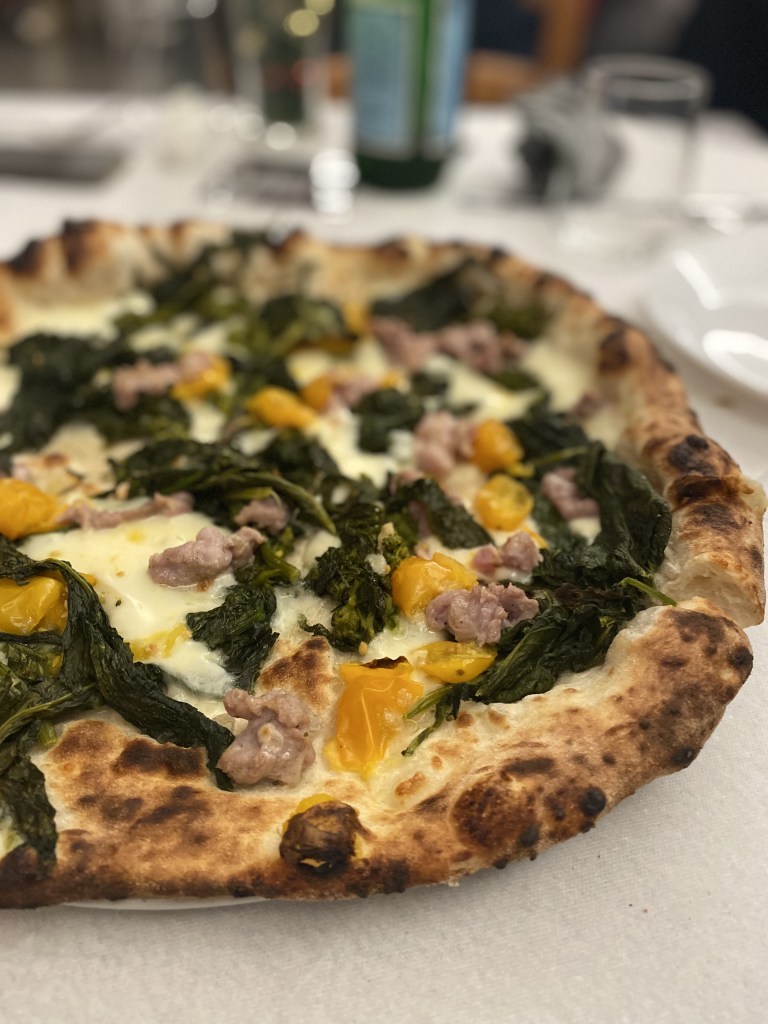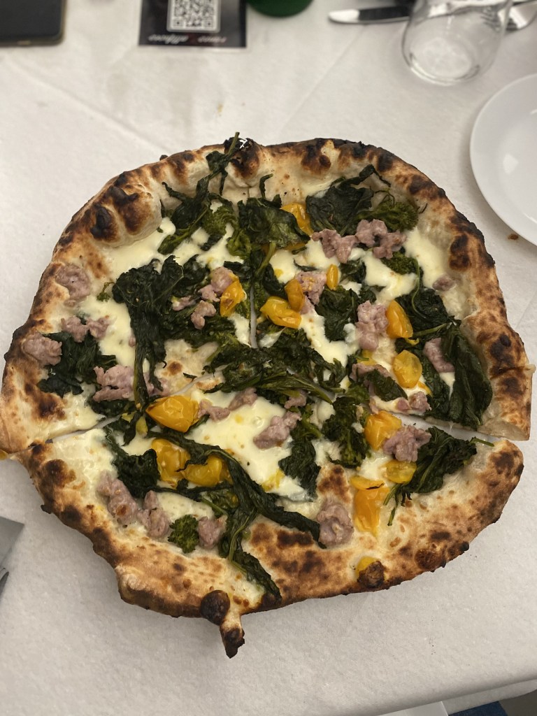 La Salsiccia e friarielli, a ruota di carro, “si è presentata come comanda Iddio.” Citazioni natalizie. Ma con qualche piacevole “sentimento” in più. Verdi piccantelli, ciccia sbriciolata e insolito pomodoro giallo. La punta di dolcezza che ripristina il morso. Bello quando la storia può essere diversa. Gallifuoco aveva ragione.
