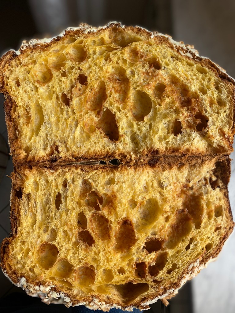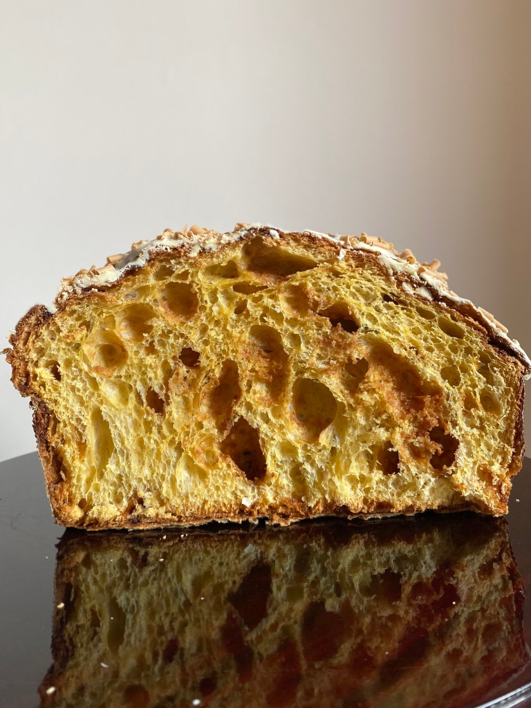 Soffice pasta lievitata, alveolatura irregolare, mollica che si strappa con grazia, si sfila come una tela. Una consistenza cremosa, avvolgente, che abbraccia, una dolcezza poco zuccherata che deve la sua particolarità allo zucchero muscovado. La prima nota biscottata cede il passo alle note più generose di caramello, burro con una buona dose di sapidità.