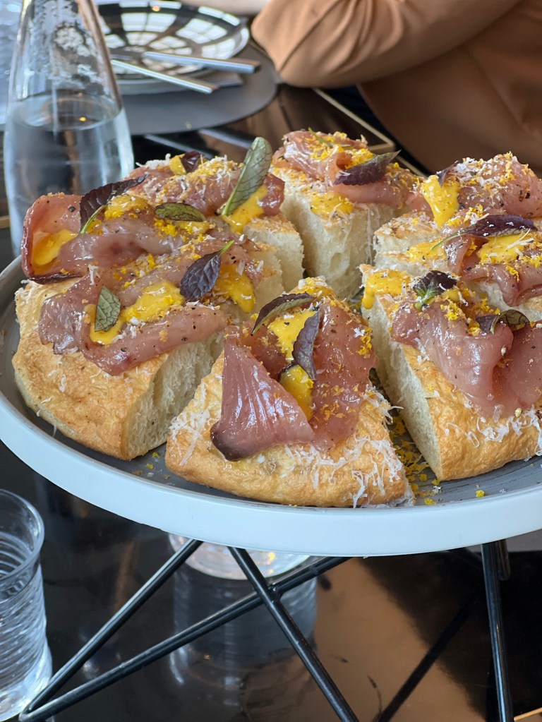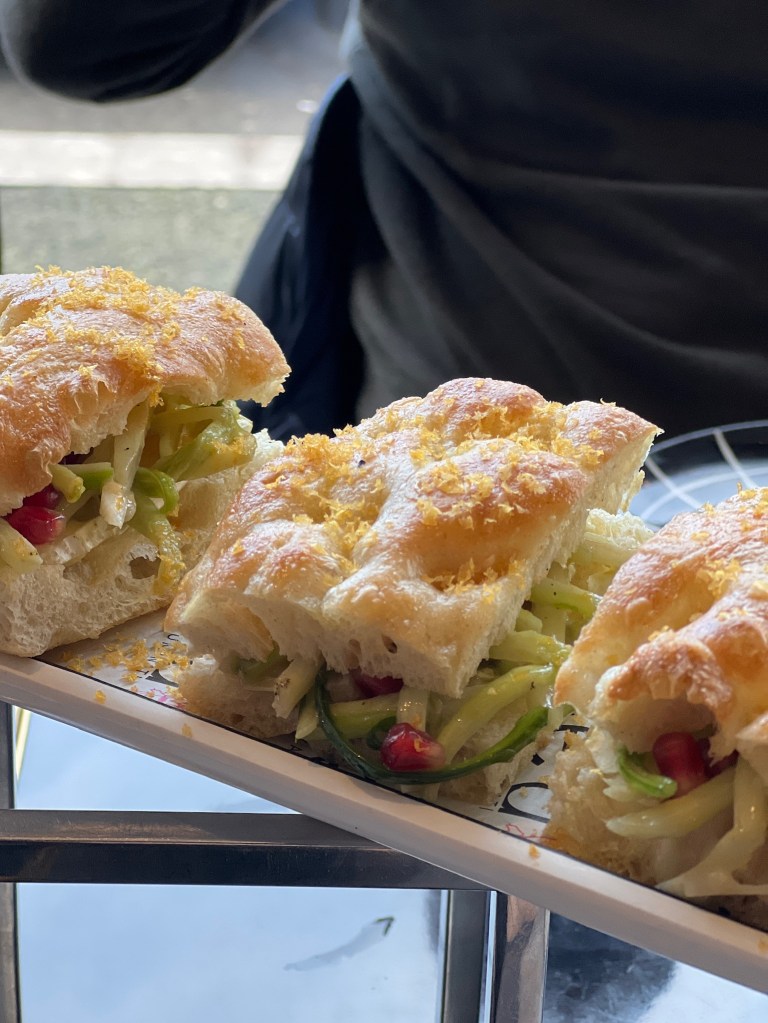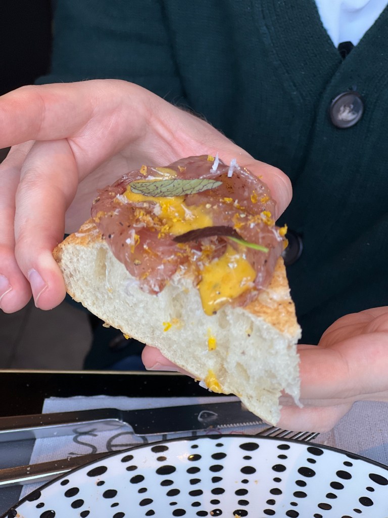 In puntarelle di piedi arriva la focaccia, manuale per essere felice. Sofficità estrema dove i germogli croccanti scoppiettano col melograno. Sentori di aglio e bottarga spingono in aromaticità e sapidità. L’abbraccio fresco e sincero de Roma.