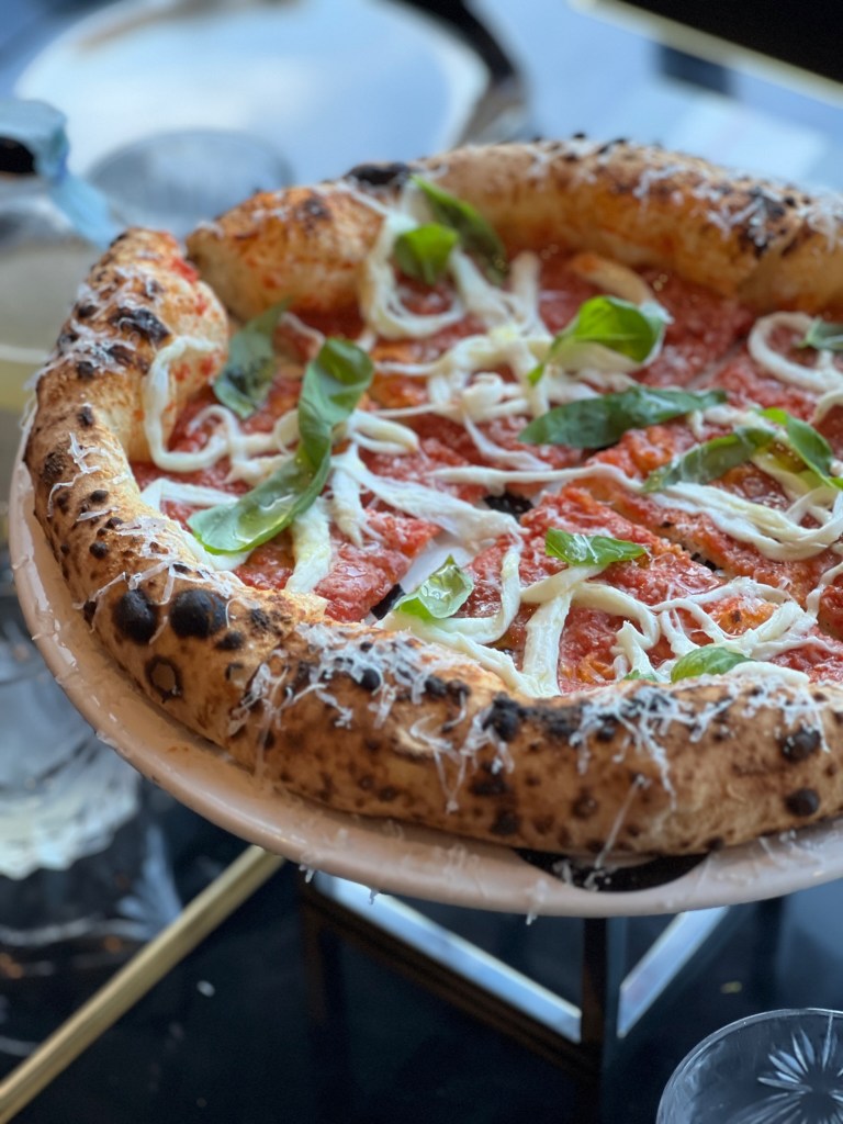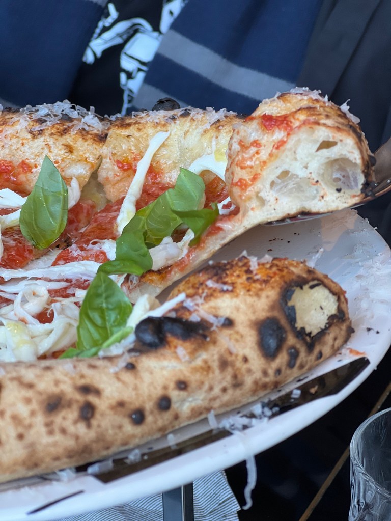 La Margherita, con treccia di fiordilatte e parmigiano, è l’esempio della regina viva e vegeta su impasto moderno. Ossimori piacevoli.