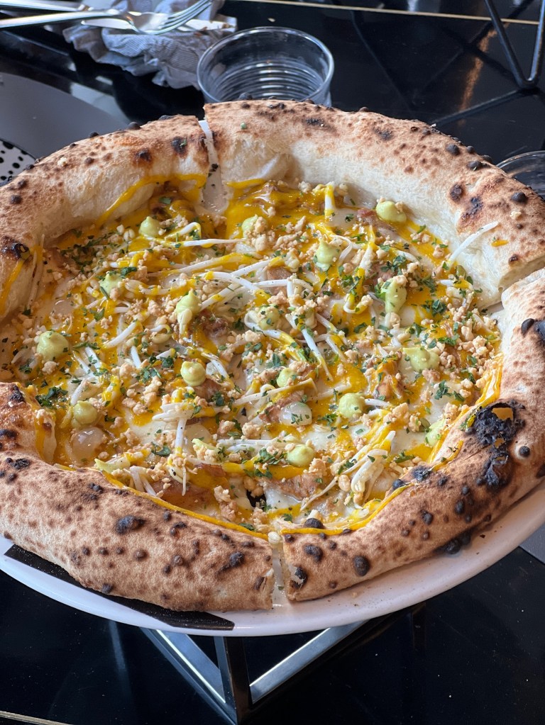 Valeria Zuppardo, moglie di Pier, quando sveste i panni della regista di sala, viaggia tanto. Novella Colombo alla scoperta di nuovi intrighi, trasforma le sue cartoline in ricordi su pizza. E così Valeria a Koh Phangan merita l’assaggio e la totale lettura del protocollo: fiordilatte, pollo con marinatura thay, germogli di soia, zabaione salato thay, latte di cocco e curry verde, crumble di anacardi, succo di lime, battuto di basilico e coriandolo. Gusto complesso, maturo. Attributi reversibili, di chi propone e accetta. Pad-thai su pizza. Folle folle folle idea. Futurama già l’ho detto. Cambiare i dogmi con toni educati. Nuovo Mondo.