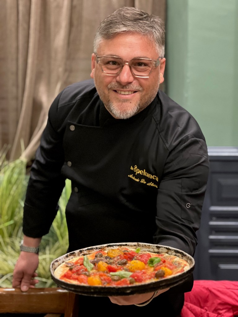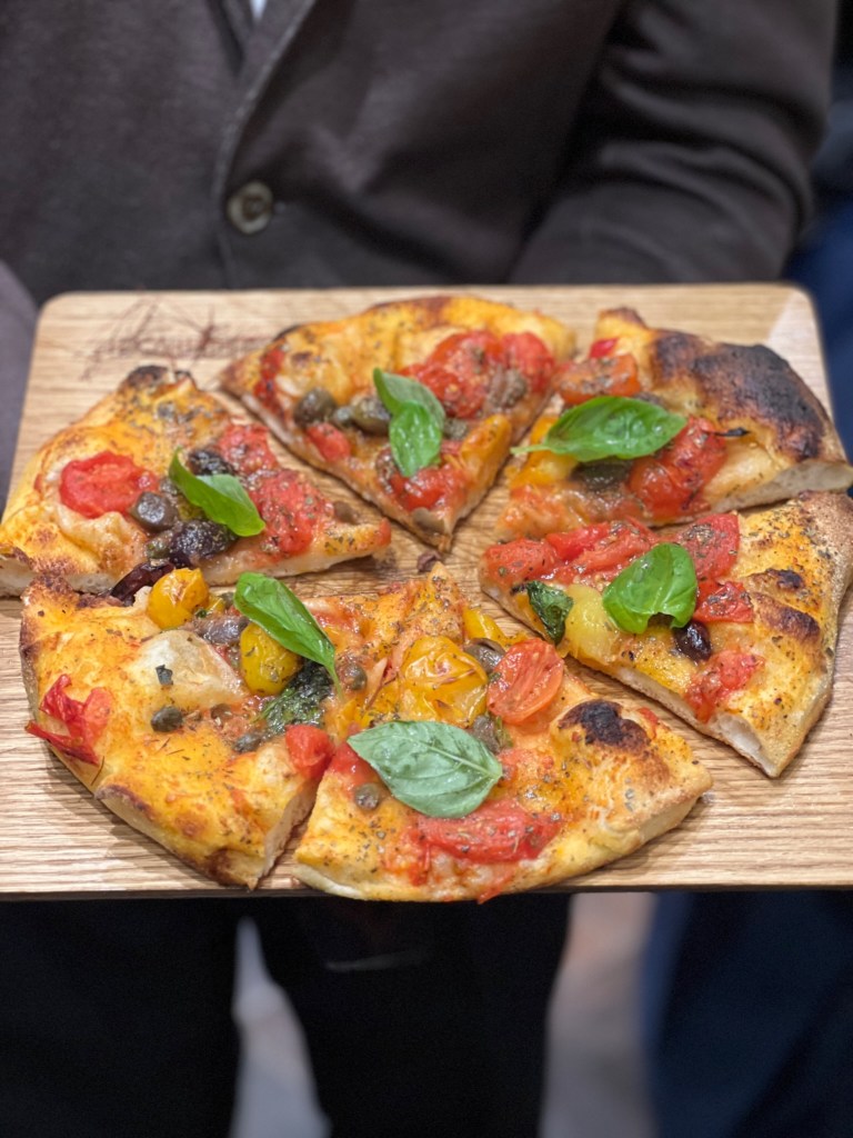 Abolita la pizza di matrice classica. A menù si fa spazio negli appetizer quella nel ruoto in sei versioni. Croccante, rustica, mangereccia dove spicca per identità e impatto la Cafoncella (pomodorini del piennolo gialli e rossi, olive di Gaeta, acciughe di Cetara, capperi di Salina, origano di montagna, aglio paesano, olio aromatizzato all’aglio).