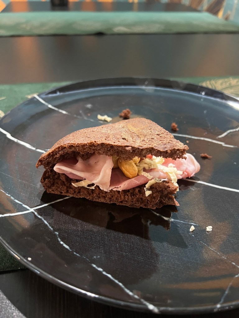 Poi l’impasto si tinge di cacao. Nino ne è teoreta. E per questa volta declinazione anche salata. Il padellino si fa sandwich, si abbassa in altezza e ne guadagna in scrocchio. Pancetta al miele La Giovanna, blu notte e anacardi tostati. Artemide vive dell’animo agreste, ruspante. Visione simpatica, cambio di marcia. Divertissement.