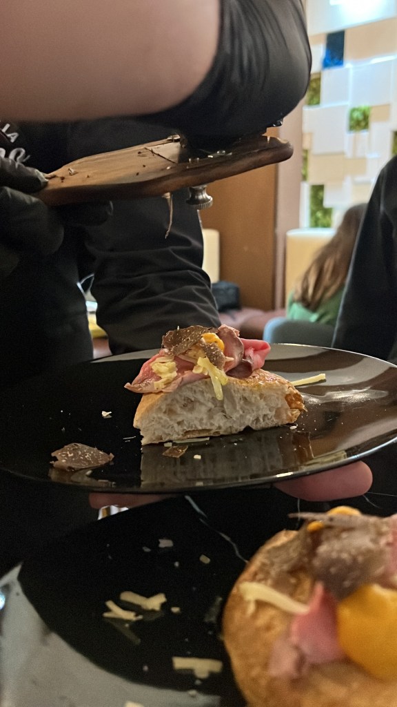 Bellezza e avvenenza, solo a leggere certi ricami. Si tratta di Apollo e la luce è accecante. Succulenza. Il roast-beef di manzo all’inglese parla. Protagonista, vero, ma il comté adorna in sapidità armonica. Tocchi di dolcezza e aromaticità col gel di carota e il tartufo nero. Dinamismo scaltro e geometrie culinarie. Equilibrista.