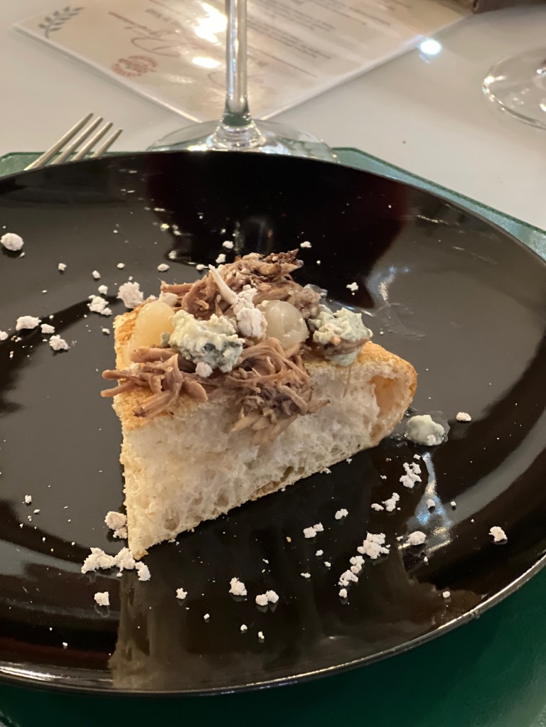 La dea della discordia mette tutti d’accordo. Eris ammalia con un elevato timbro materico e un design navigato. Vanità e fascino dal primo all’ultimo morso. Il bleu de brebis Cirè crea dipendenza e si esalta nell’acidità del gel di mela annurca. Sotto una pioggia di terra di nocciole di Giffoni sguazza compito lo stracotto di maiale all’Elixir Falernum. Piatto su pizza.
