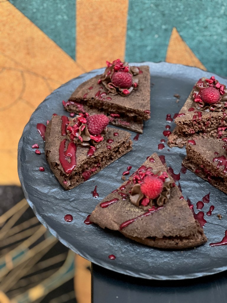 Infine Eros scocca la freccia e si fa l’amore con il sapore cit. Padellino al cacao, double face, con mousse al gianduia e lamponi. Cremosità, consistenze, parole non dette… Eros, che hai combinato!