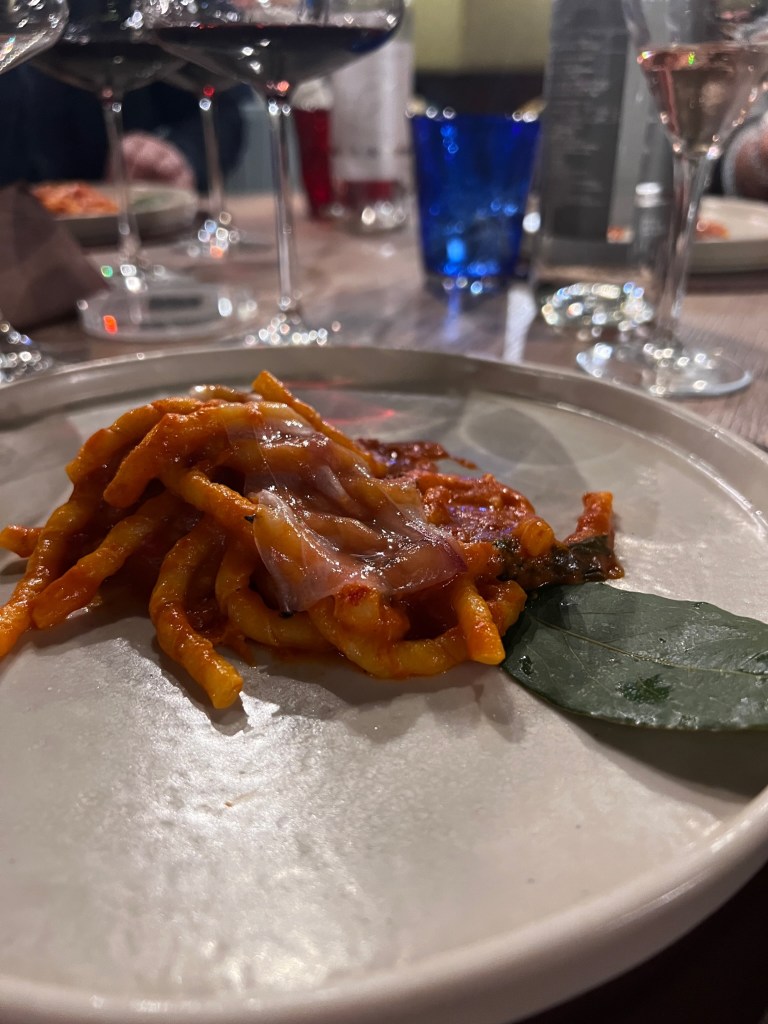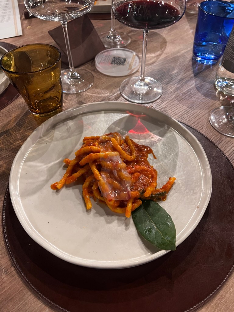 Poi l’equilibrio estatico. Preferisco avvolgere un gomitolo di fusilloni avellinesi che avvolgermi nei luoghi comuni, ma lardiati con pomodoro, cipolla, lardo di Mangalica e pecorino romano restano l’effige della gloria anti-fighetta che sprona. Lardiata eterna come dovrebbe essere, così fluida da plasmare un sentimento. Bis tris quater!