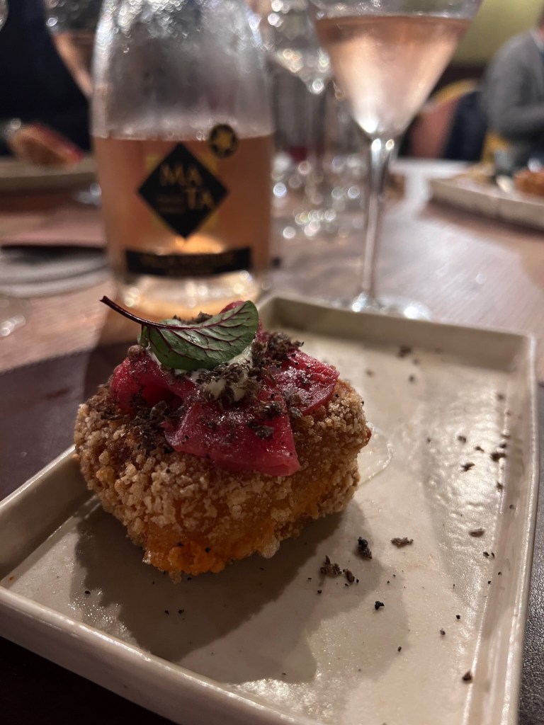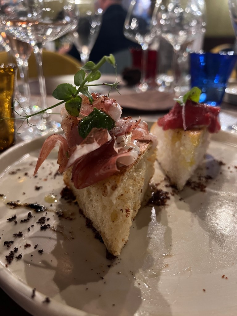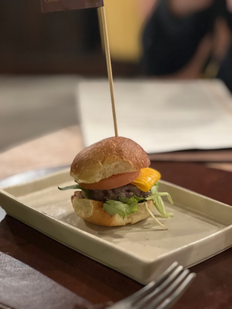 Un accademico mini burger di Wagyu con pomodoro, misticanza e cheddar, profumato di grazia e leggiadria (da bis e tris) precede una gioconda mozzarella in carrozza, con carpaccio di Chianina, maionese alla colatura di alici e tartufo nero di Roccamonfina. Dimensione di godibilità continuativa.