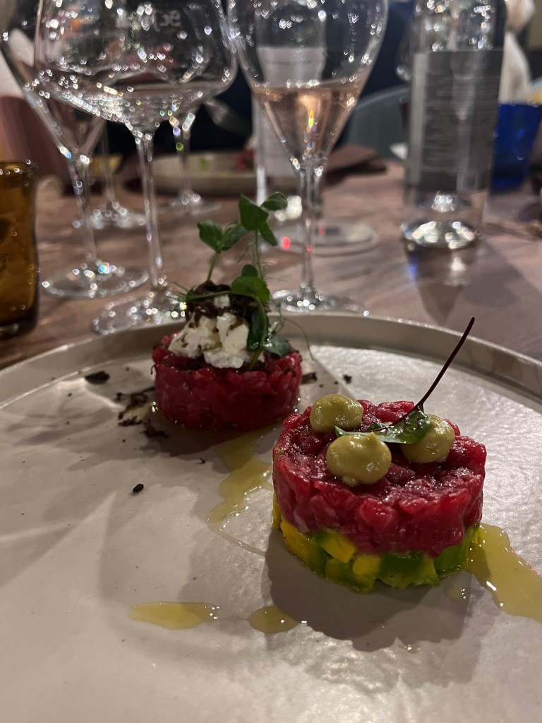 Pronti-via, bis di tartare. Black Angus con burrata di bufala campana e tartufo nero di Roccamonfin, manifesto brillante del territorio; Fassona Piemontese con avocado, saettata virtuosa ibrida. Sussulti famelici disinibiti.