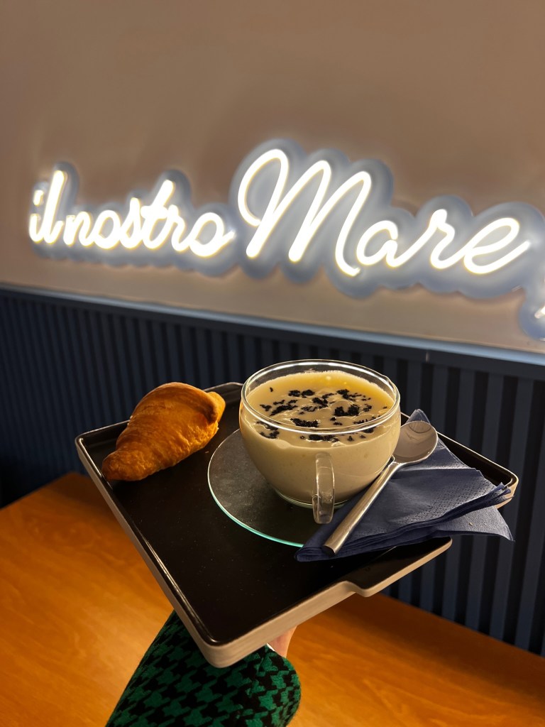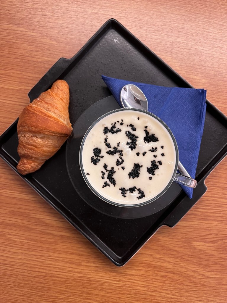 Momento contemplazione. La panacea che ti riconcilia col mondo. Arte moderna edibile di un rituale mattutino. Come in un Escher: cappuccino di astice, cornetto salato e la sua bisque. Meglio di colazione da Tiffany. C’è ingegno, c’è illusione, c’è bellezza, c’è soprattutto un’idea saporita. Ammaliato.