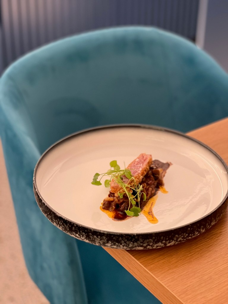La dolcezza e la consistenza della capasanta incontrano il sapido abbraccio del lardo, la cremosità del mix di burrata e piselli e l’umami tartufato. Lavorato con l’accortezza di chi vuole portarti in riva al mare tra curve di paesaggi. Immersivo.