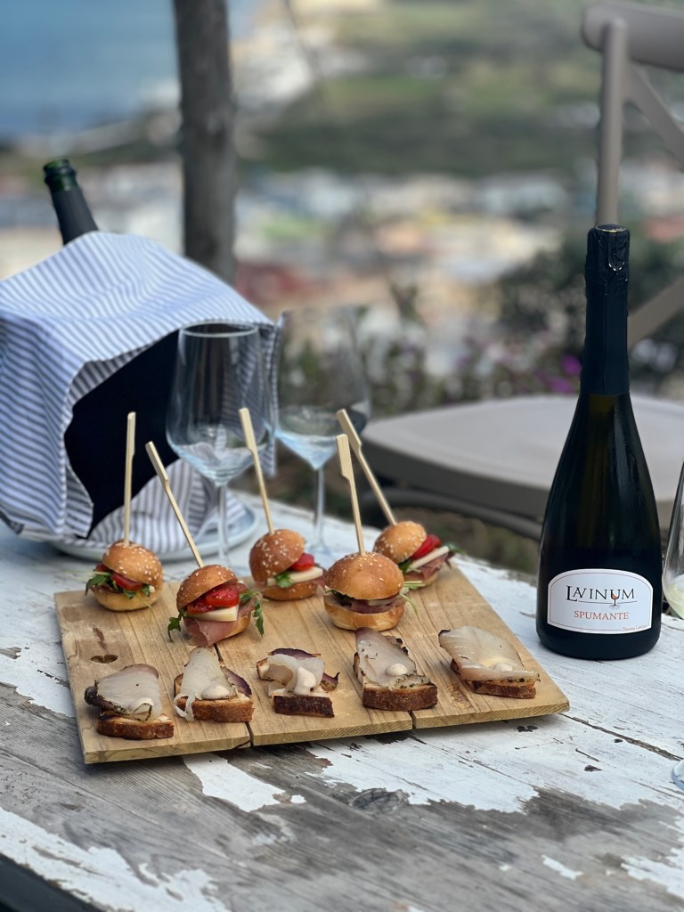 Aperitivo tra le vigne in faccia al mare con salumi di mare con Falanghina, sia in versione ferma che spumante, di casa Lavinum.