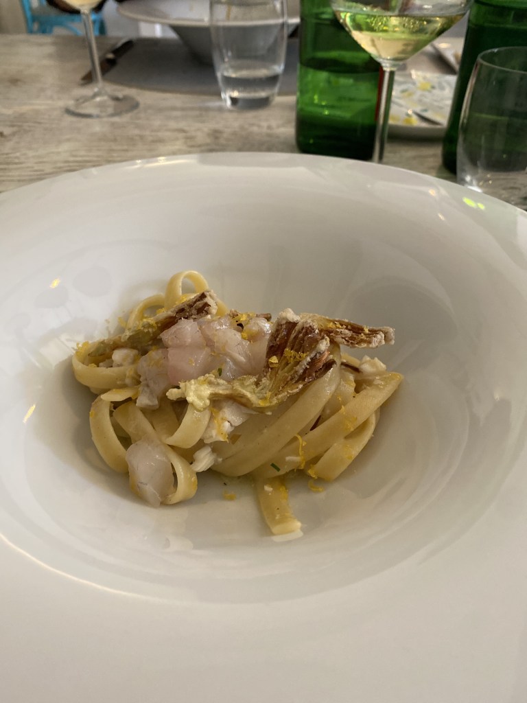 Stessi sorrisi per l’apoteosi anti-fighetta di una fettuccia di Gragnano con ombrina frollata sette giorni cotta e cruda, la sua bottarga e carciofi. La narrazione si armonizza nel pentagramma passionale dello chef: rispetto ed esaltazione della materia nella privazione di effetti allucinogeni. Disarmato.