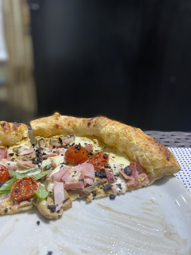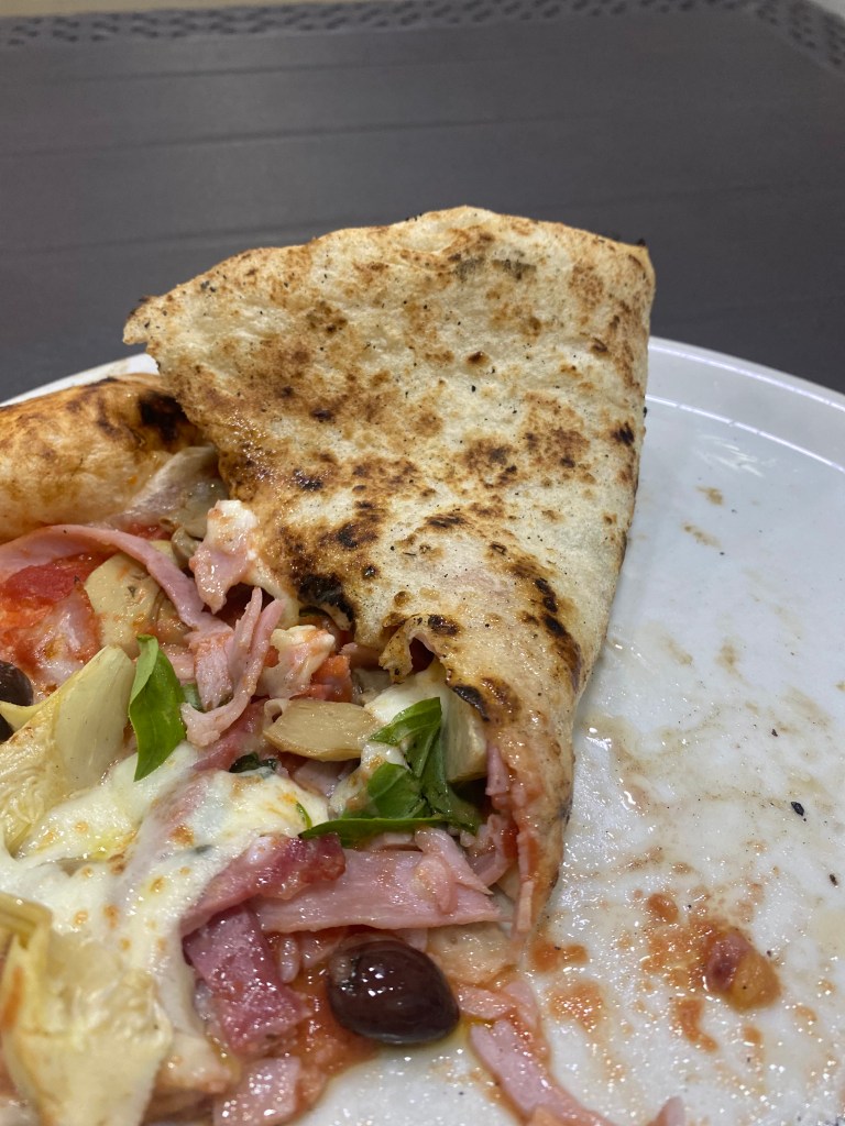 Bontà spogliata delle sue complicazioni. Ombra rossa, prosciutto cotto, salame, funghi, carciofini, olive nere. Interminata.