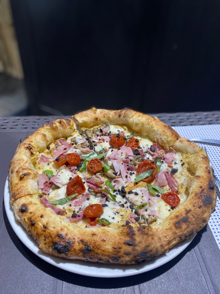 E mo ti arrendi nuovamente alle formosità lievitate in chiave rivisitata. Perché tutto ciò che passa nelle mani di Gaetano si veste di candore e levità confortevole. Capricciosa moderna, capricciosa vanitosa. Crema di carciofini, funghi, pomodorini confit, prosciutto cotto, salame, polvere di olive nere. Euforia di gusto, mix di consistenze e fusione tra le parti. Una realizzazione squillante.