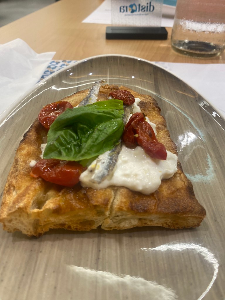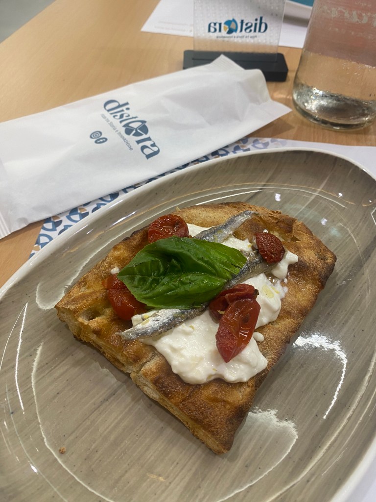 Come un amuse-bouche la Pala con Burrata e alici. Un vol-au-vent di cremosità e umami, arricchito dalla dolcezza del confit e dalla freschezza della zest di limone. La base cruncha con educazione, ma conserva un cuore tenero e strutturato che interpreta la pianezza di un topping stechiometrico. Pervaso.