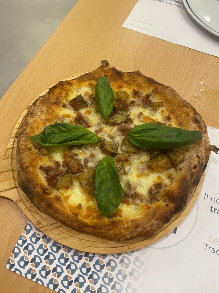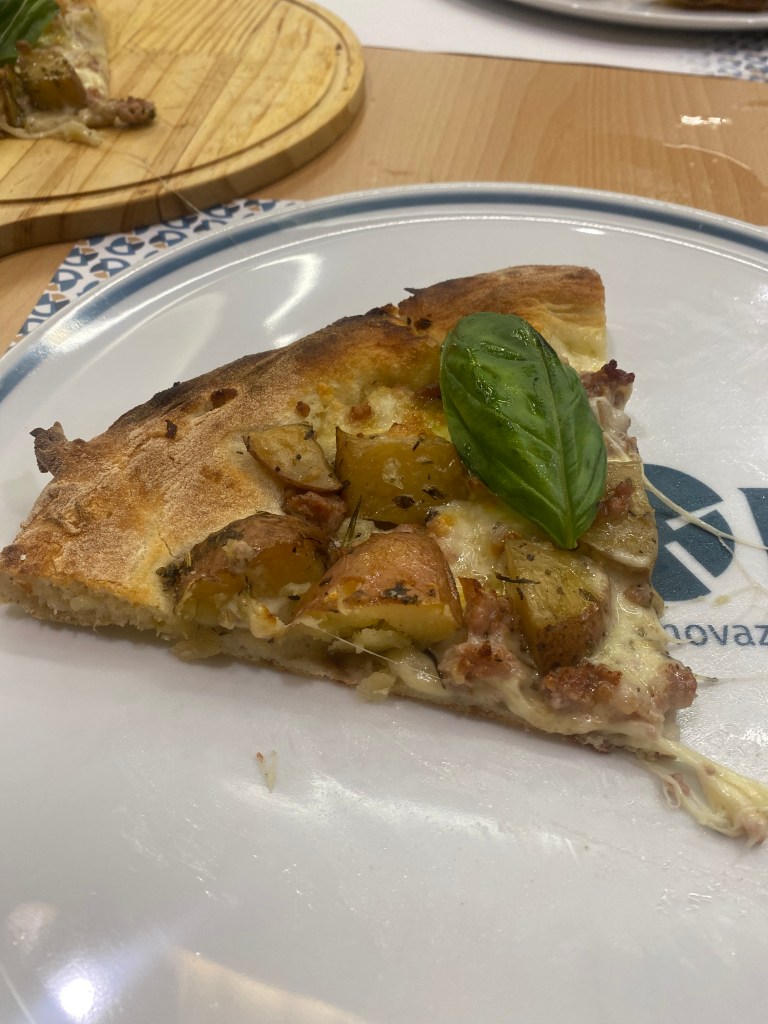 Nel Ruoto è ruspante, al cubo con Salsiccia e patate. Un impasto che scrocchia pur non perdendo una piacevole morbidezza. La ciccia è sbriciolata, il tubero con buccia sa di terra, di campagna, di genuinità. Rassicurante.