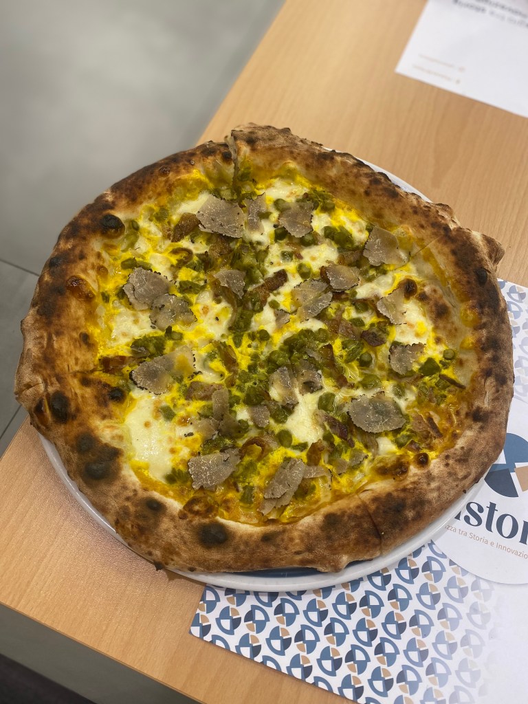 Poi la propriamente-detta. Impasto diretto, alta idratazione con farina con germe di grano. Cottura uniforme e una poesia bucolica. Tuorlo d’uovo pastorizzato, fiordilatte, asparagi, pancetta locale saltata in padella, tartufo nero irpino, olio al tartufo. Territorio e materia, stessa meccanica del percorso. Un morso pieno, complesso, indipendente, che coniuga, con talento e coerenza, cromie ataviche. Ruggito popolare e contadino.