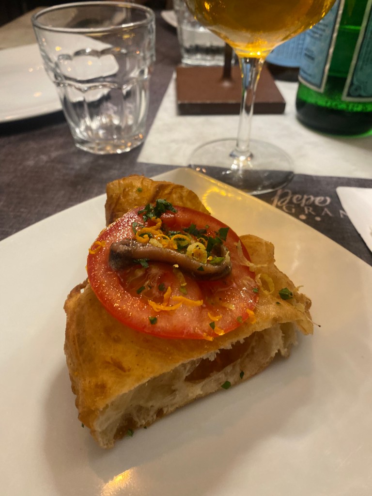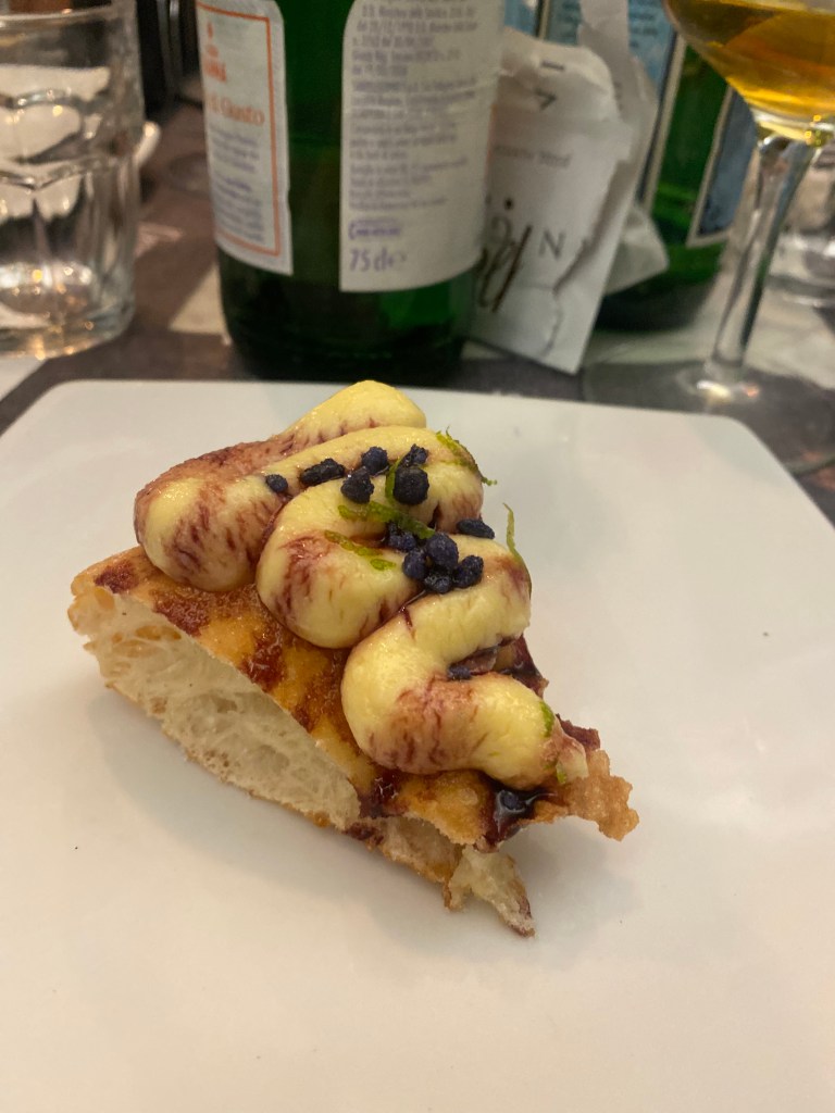 Ogni volta che si addenta la Scarpetta il tavolo sperimenta il fenomeno del parossismo. Impalpabile/massiccia texture dalla cremosità micidiale, scandita da una linfa acida, dolce, aromatica, rotonda, succosa, corroborante. Da mandare fuori chiunque.
